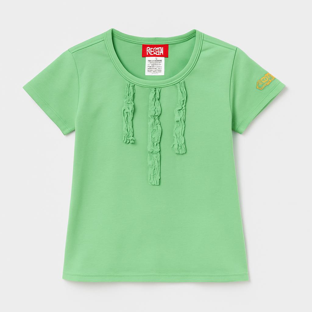 Questa adorabile t-shirt verde lime è perfetta per le giovanissime fashioniste! Realizzata in morbido cotone, presenta dettagli arricciati sul davanti che aggiungono un tocco di originalità e un ricamo colorato sullo spallino. Le maniche corte e il taglio leggero la rendono ideale per le giornate di sole e per avventure all’aperto. Anche se è un capo usato, si presenta in ottime condizioni, pronta per essere indossata da una piccola amante dello stile! Un must-have per un look fresco e vivace!