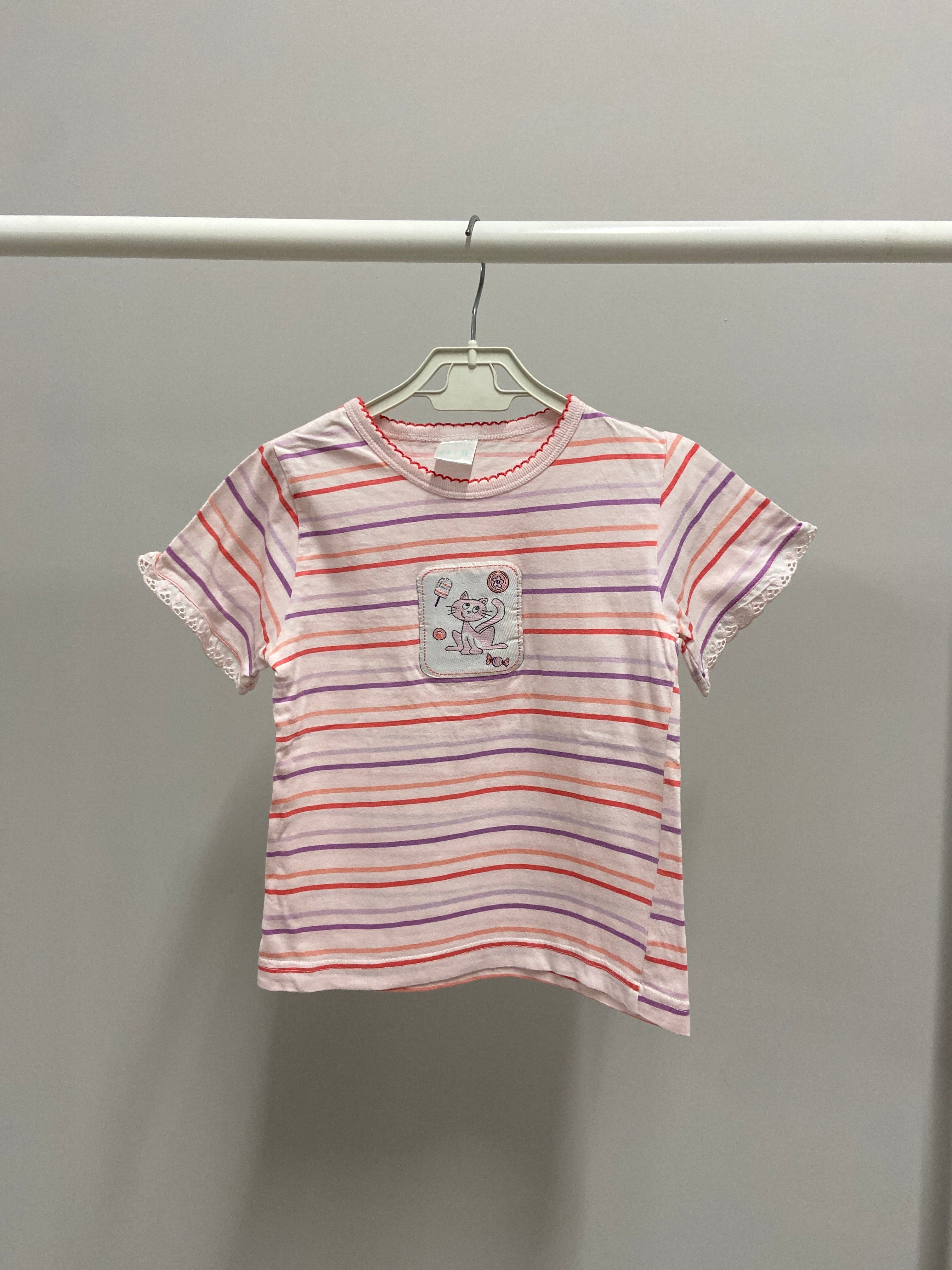 Questa deliziosa t-shirt a righe per bambina è un'aggiunta perfetta al guardaroba estivo! Realizzata in morbido cotone, presenta una palette di colori pastello che trasmette dolcezza e freschezza. Il tocco di pizzo sulle maniche donano un'eleganza romantica, mentre la stampa centrale con un simpatico disegno aggiunge un tocco giocoso e divertente. Nonostante sia un capo usato, si presenta in ottime condizioni, pronta a vivere nuove avventure con la tua piccola. Un must-have per look casual e colorati!
