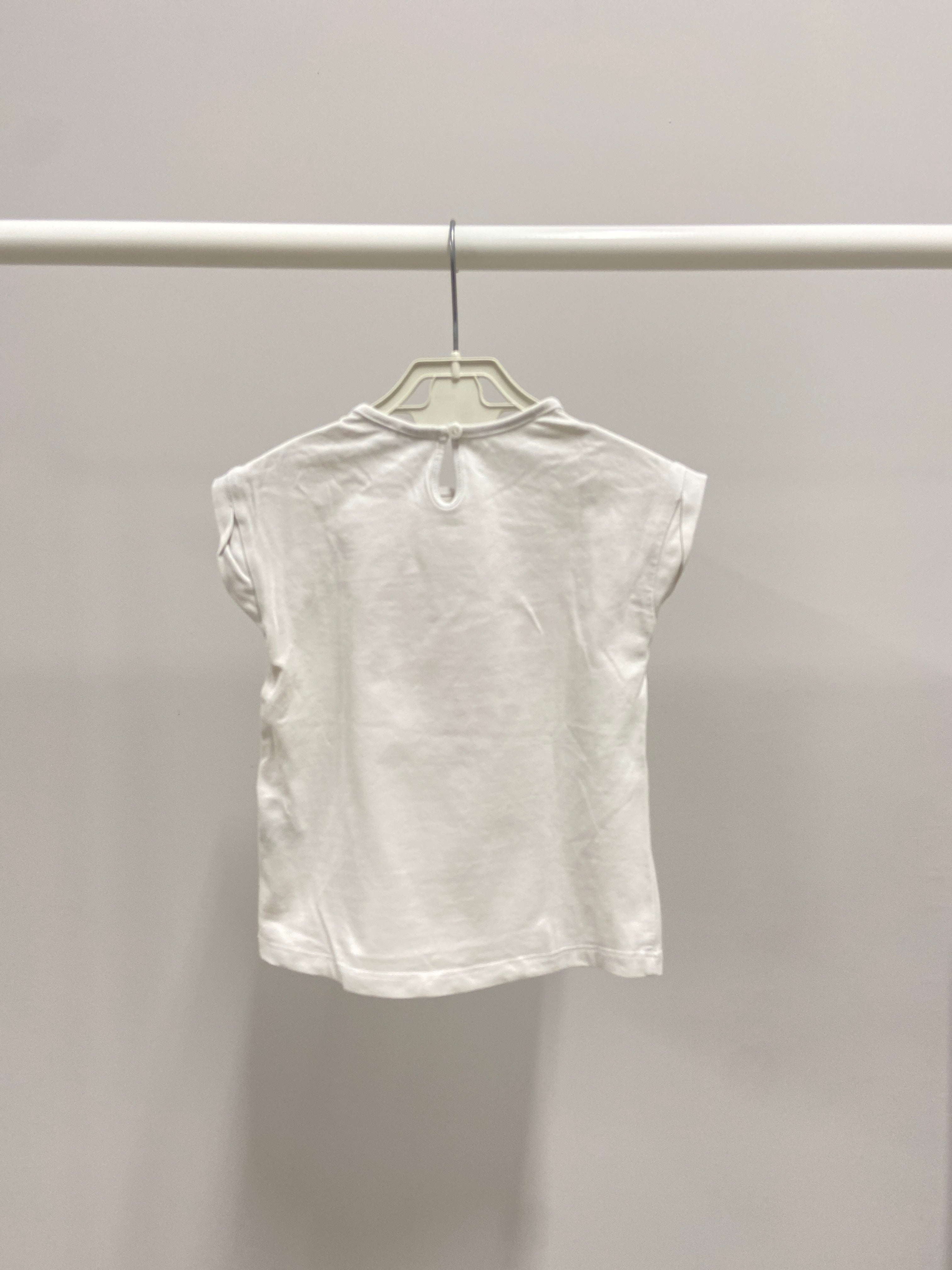Questa deliziosa t-shirt bianca è un capo essenziale per ogni piccolo guardaroba! Realizzata in cotone morbido e traspirante, mantiene la tua bambina comoda e fresca durante le calde giornate estive. Il design semplice e versatile permette di abbinarla facilmente a qualsiasi pantalone o gonna, rendendola perfetta per ogni occasione. La delicata chiusura sul retro aggiunge un tocco chic e pratico. Nonostante sia un capo usato, si presenta in ottime condizioni, pronto per nuove avventure! Un must-have per le piccole esploratrici!