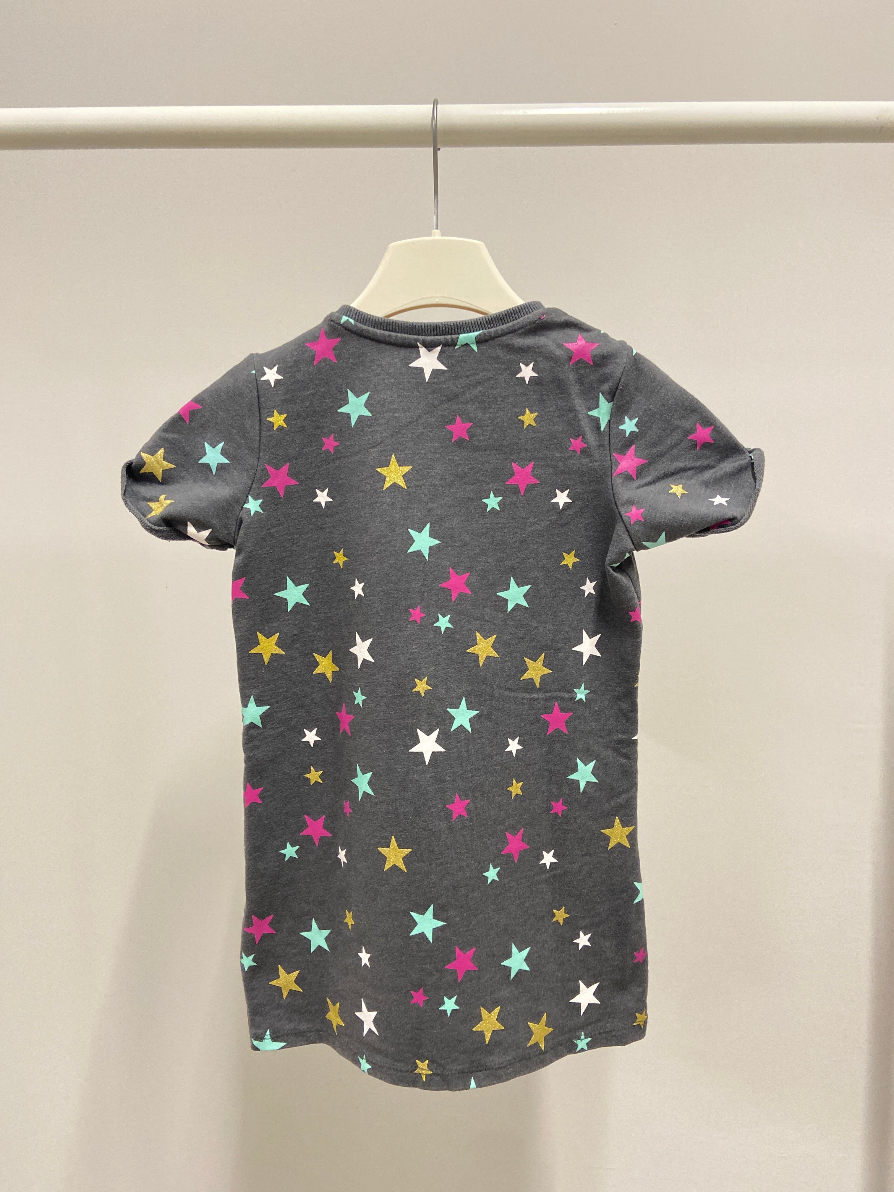 Questo adorabile abito grigio con stelle colorate è perfetto per far brillare i sogni della tua piccola! Realizzato in morbido cotone, offre comfort e freschezza in ogni occasione. Il design giocoso con stelle in sfumature di rosa, giallo e turchese rende ogni giorno speciale. Le maniche corte e il taglio semplice lo rendono ideale per il gioco o le uscite estive. Anche se usato, si presenta in ottime condizioni, pronto per nuove avventure! Un must per le piccole stelle del tuo cuore!