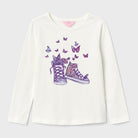 Questa deliziosa maglietta bianca a maniche lunghe è perfetta per le piccole sognatrici! Realizzata in un morbido cotone, presenta una fantastica grafica di scarpe da ginnastica decorate con farfalle colorate, che sprizzano gioia e creatività. Il design vivace la rende ideale per qualsiasi occasione, dai pomeriggi di gioco al rendez-vous con le amiche. Nonostante sia un capo usato, si trova in ottime condizioni e porterà un tocco di stile e allegria nel guardaroba della tua bimba! Una maglietta perfetta per esprimere la sua personalità unica!