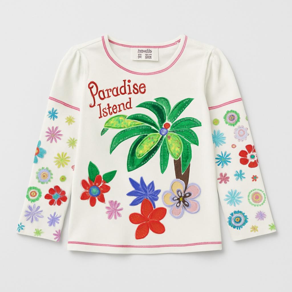 Questa graziosa maglietta a maniche lunghe trasmette un'atmosfera estiva e giocosa! Realizzata in morbido cotone, presenta un delizioso design con palme e fiori colorati che evocano un vero "Paradise Island". Le maniche adornate da un floreale vivace creano un look unico e allegro, perfetto per le piccole sognatrici. Questo capo usato è in ottime condizioni e ideale per giocare in libertà o per eventi informali. Aggiungi un tocco di colore e fantasia al guardaroba della tua bimba!