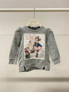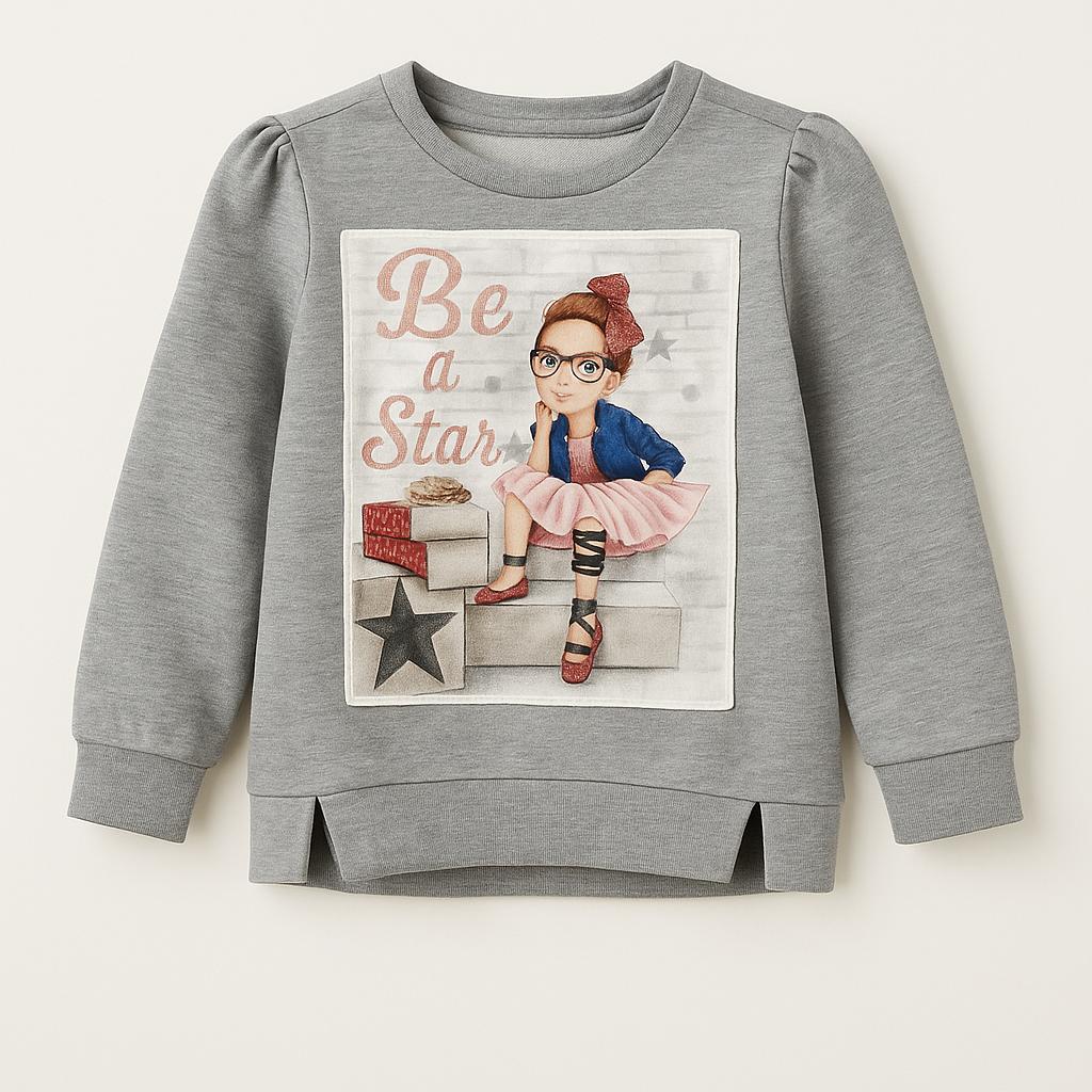 Affronta le giornate fresche con questa adorabile felpa grigia, perfetta per le piccole star! Realizzata in morbido materiale, garantisce comfort e calore. Sul davanti, un'illustrazione vivace di una bambina in un outfit da sogno, accompagnata dalla scritta "Be a Star", sprigiona un messaggio di creatività e autostima. Le maniche arricciate aggiungono un tocco di femminilità, mentre i dettagli aperti ai lati offrono un tocco trendy e moderno. Pur essendo un capo pre-amato, è in ottime condizioni e pronto per far brillare il guardaroba della tua piccola! Perfetta per un look casual e stiloso, ideale per la scuola o le uscite con gli amici.