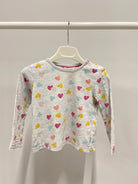 Questa adorabile maglietta a maniche lunghe è perfetta per le piccole romantiche! Realizzata in morbido cotone, il suo color grigio chiaro è ravvivato da un vivace motivo di cuoricini colorati in tonalità pastello di rosa, giallo e azzurro. Con un taglio comodo e leggermente svasato, è ideale per le giornate di gioco o per una passeggiata nella natura. Nonostante sia un capo di seconda mano, si presenta in ottime condizioni, pronta a fare felice una piccola perché è un vero e proprio pezzo di dolcezza per ogni guardaroba!