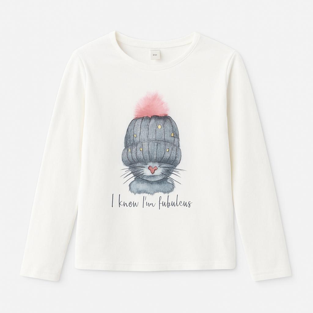 Questa adorabile maglietta a maniche lunghe è perfetta per le piccole amanti degli animali! Realizzata in morbido cotone bianco, presenta un dolcissimo graphic print di un gattino con un cappello invernale, accompagnato dalla scritta "I meow I'm fabulous". Un tocco di stile e umorismo che certamente strapperà un sorriso! Ideale per i giorni più freschi, si presta sia per un look casual che per occasioni speciali. Nonostante sia un capo usato, si presenta in ottime condizioni, pronto a regalare comfort e stile nelle avventure quotidiane della tua piccola!