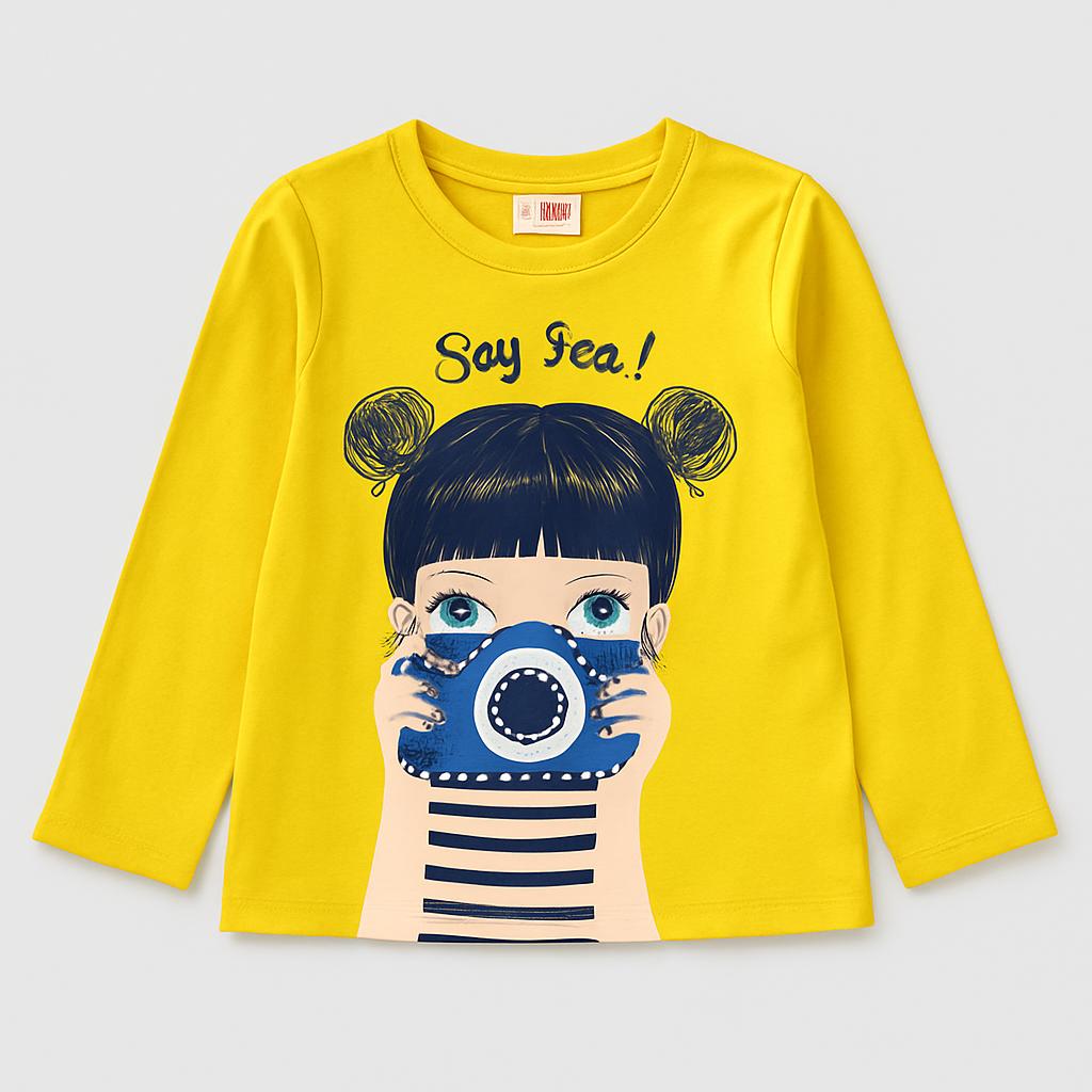 Questa adorabile t-shirt gialla è un vero colpo di fulmine per le piccole fotografe! Realizzata in morbido cotone, presenta un grazioso motivo con una bambina che tiene in mano una fotocamera, perfetta per stimolare la creatività. Le maniche lunghe la rendono ideale per le fresche giornate primaverili o per un giro al parco. Nonostante sia un capo usato, si presenta in ottime condizioni e aggiunge un tocco vivace e giocoso a qualsiasi guardaroba. Un must-have per le piccole esploratrici!