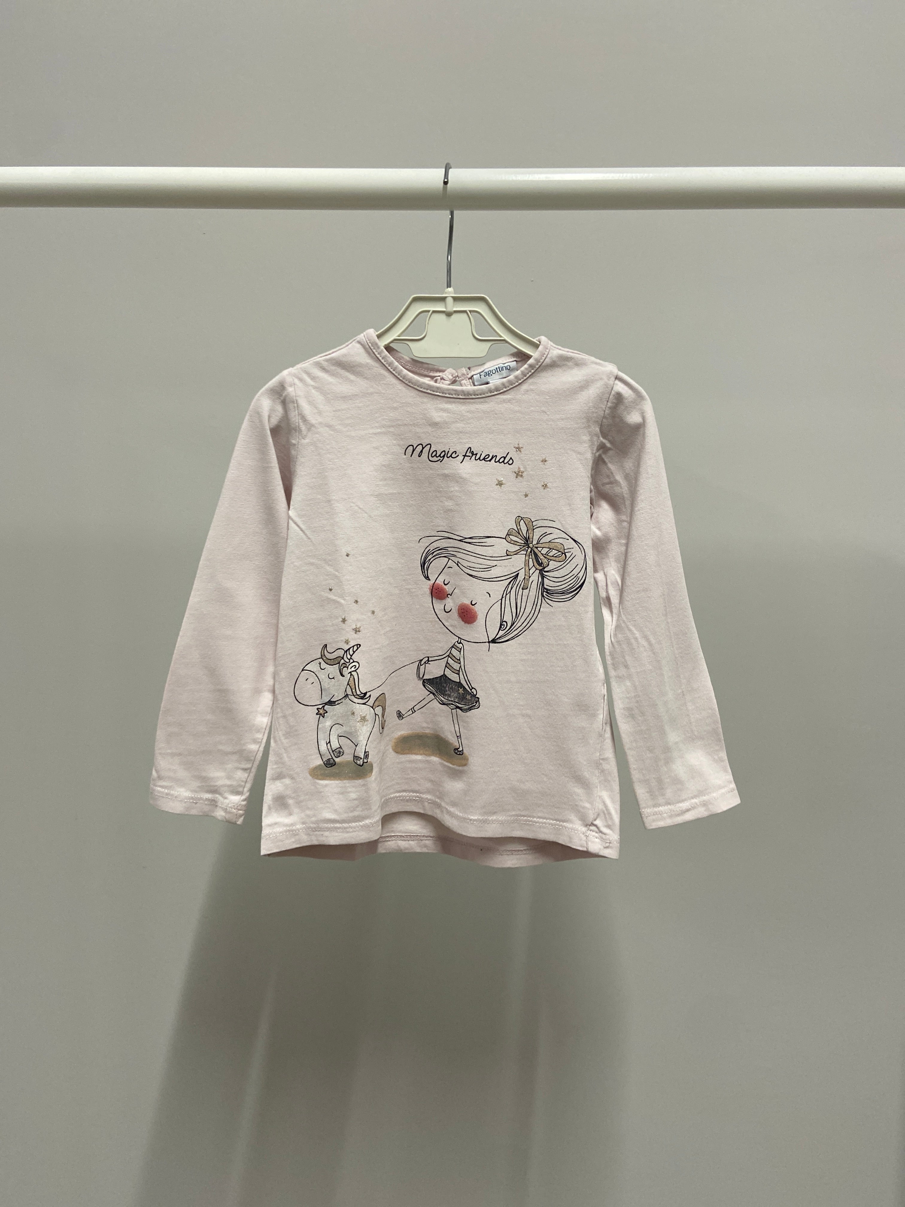 Questa adorabile maglietta a maniche lunghe è perfetta per le piccole sognatrici! Realizzata in un morbido cotone di colore rosa pallido, presenta un'incantevole stampa di una dolce bimba con un simpatico pony. I dettagli scintillanti aggiungono un tocco magico, rendendo ogni giornata speciale. Il taglio comodo la rende ideale per giochi e avventure, mentre il tessuto leggero è perfetto per vari strati. Anche se è un capo usato, è in ottime condizioni, pronta per accompagnare la tua piccola in mille avventure!