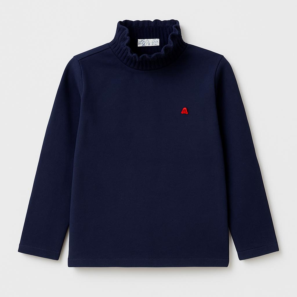 Questa elegante maglia a maniche lunghe in tinta unita blu scuro è un vero must-have per il guardaroba dei bambini! Realizzata in morbido cotone, offre comfort e calore durante le giornate più fresche. Il colletto arricciato aggiunge un tocco chic e raffinato, rendendola perfetta per occasioni speciali o per un look quotidiano elegante. Sul lato sinistro, un piccolo logo rosso offre un'affascinante nota di originalità. Nonostante sia usata, la maglia è in ottime condizioni e pronta per accompagnare il tuo piccolo in tante avventure! Un capo versatile che non può mancare nell'armadio!
