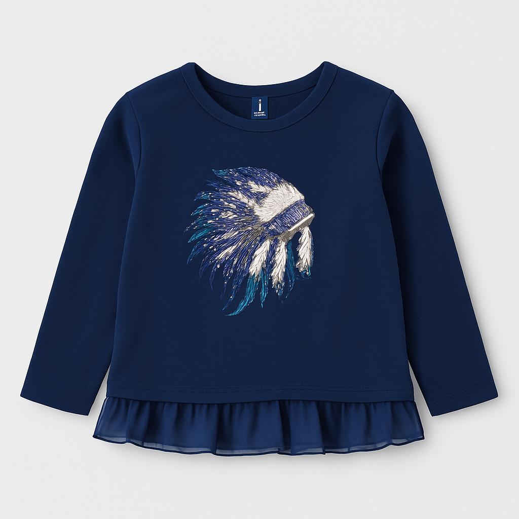 Questa adorabile maglietta blu notte è perfetta per le piccole esploratrici! Realizzata in morbido cotone, sfoggia un divertente design con un elegante motivo di piume e dettagli scintillanti sul fronte. Il particolare orlo in chiffon aggiunge un tocco di classe e movimento, rendendola ideale per ogni occasione, dalle feste ai momenti di gioco. Le maniche lunghe e il taglio comodo la rendono perfetta per le giornate più fresche. Nonostante sia un capo usato, la maglietta si presenta in ottime condizioni, pronta a diventare il nuovo favorito nel guardaroba della tua piccola!