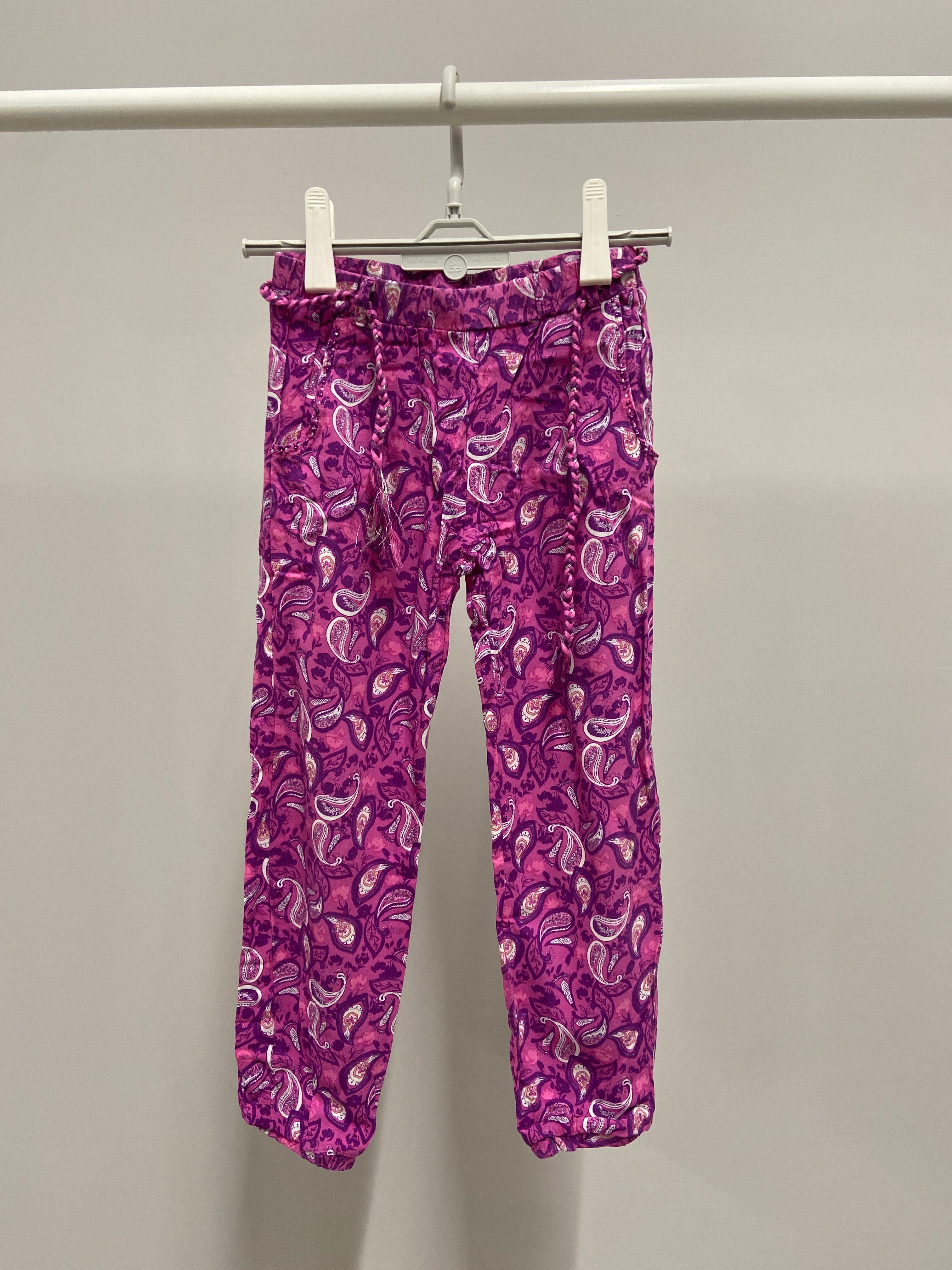 Questi pantaloni colorati sono un vero e proprio sogno per le piccole esploratrici! Caratterizzati da un vivace motivo paisley in tonalità rosa e viola, aggiungono fascino e originalità a qualsiasi outfit. Realizzati in un tessuto leggero e morbido, garantiscono comfort e libertà di movimento durante il gioco e le avventure quotidiane. La vita elasticizzata e i lacci regolabili assicurano una vestibilità perfetta. Nonostante siano usati, si presentano in ottime condizioni, pronti a portare un tocco di allegria nel guardaroba della tua bambina! Un capo ideale per creare combinazioni divertenti e colorate!
