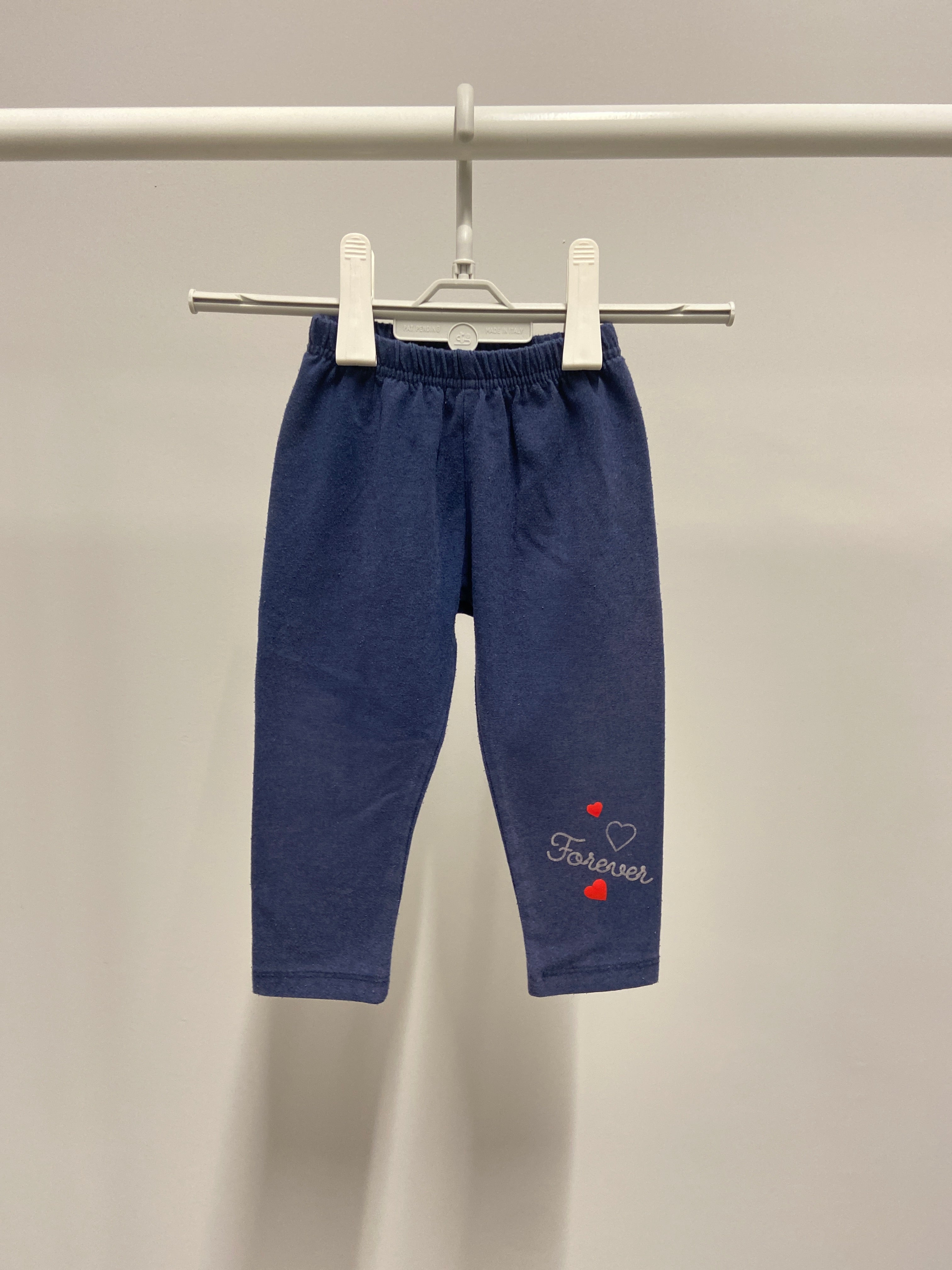 Questi adorabili leggings blu scuro sono l'ideale per ogni piccola esploratrice! Realizzati in un morbido e confortevole cotone, offrono un'ottima vestibilità e libertà di movimento. Sul lato sinistro, un simpatico ricamo rosso con la scritta "Forever" e cuoricini aggiunge un tocco di dolcezza. Perfetti per abbinarli a t-shirt colorate o a felpe per un look casual e alla moda. Nonostante siano usati, si presentano in ottime condizioni e sono pronti per accompagnare la tua bimba in tante avventure divertenti!