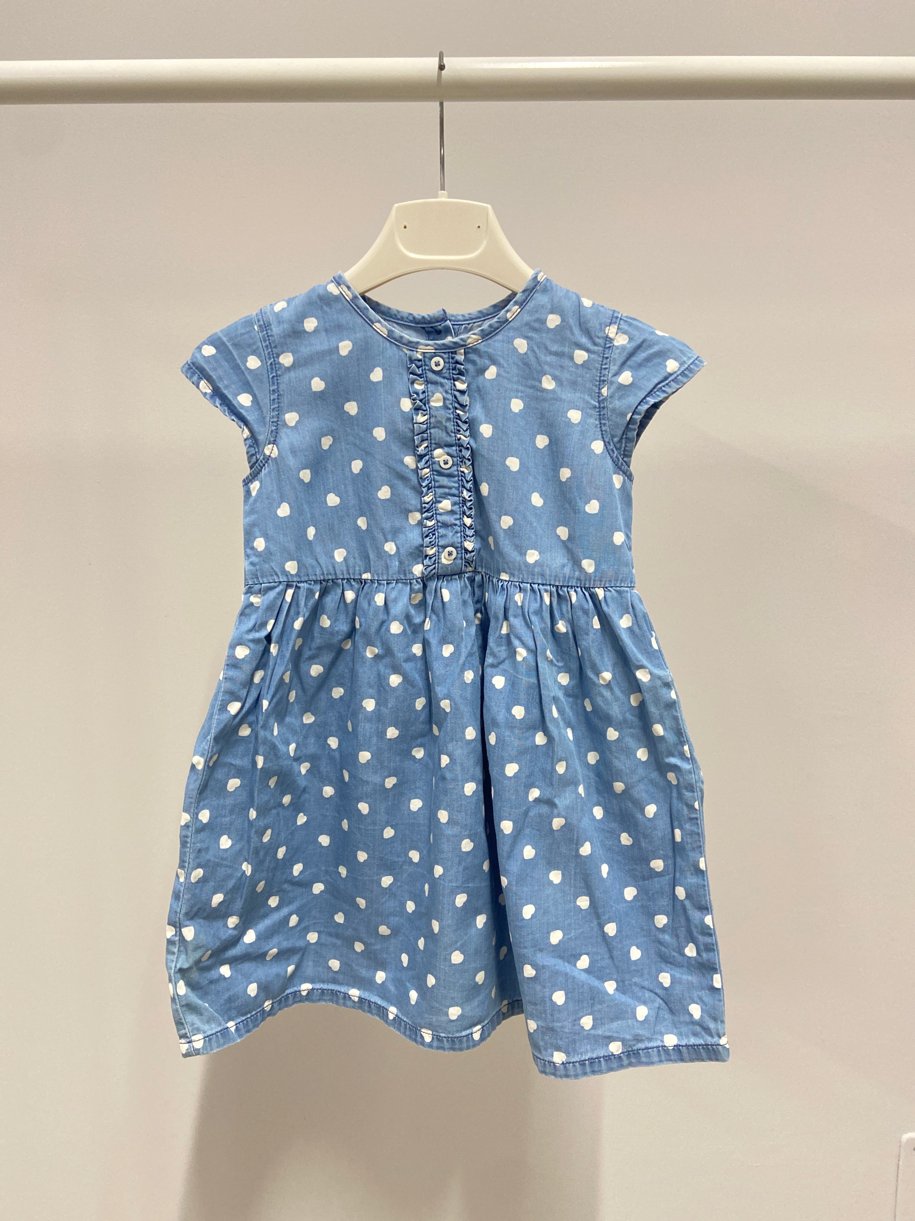 Questo adorabile vestitino in denim è perfetto per le piccole esploratrici! Con una fresca tonalità azzurra e una vivace fantasia a pois bianchi, aggiunge un tocco di allegria al guardaroba estivo. Le maniche corte e il taglio svasato garantiscono comfort e libertà di movimento, perfetto per giocare e divertirsi. La fila di bottoni sul davanti rende il vestito pratico e alla moda, facile da indossare. Nonostante sia un capo usato, si presenta in ottime condizioni, pronto per accompagnare ogni avventura! Un'ottima scelta per le bambine che amano sentirsi speciali!
