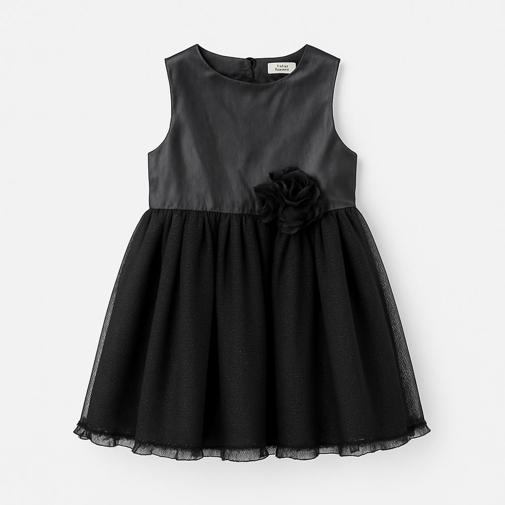 Questo elegante vestito da festa è perfetto per le piccole principesse! Realizzato in un delicato tessuto nero con una raffinata finitura lucida, presenta un corpetto senza maniche e una gonna ampia in tulle trasparente. Un adorabile fiore in tessuto sul lato aggiunge un tocco di femminilità e stile. Ideale per ogni occasione speciale, dalle feste di compleanno ai matrimoni, questo vestito farà brillare ogni piccola fashionista! Anche se è un capo usato, è in ottime condizioni, pronto per essere indossato in una memorabile avventura!
