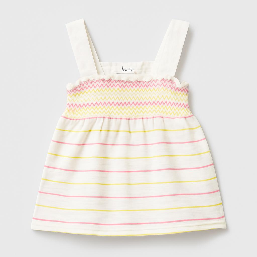 Questa incantevole canottiera per bambine è perfetta per aggiungere un tocco di freschezza al guardaroba estivo! Realizzata in morbido cotone, presenta una deliziosa fantasia a righe in tonalità vivaci: bianco, rosa, giallo e verde. Le spalline regolabili e il delicato punto smock sulla parte superiore le conferiscono una veste chic e comoda, ideale per le passeggiate al parco o le giornate al mare. Nonostante sia un capo usato, si presenta in ottime condizioni e pronta per accompagnare le piccole esploratrici nelle loro avventure! Un must-have per ogni piccola fashionista!