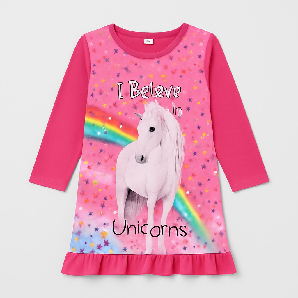 Questo incantevole abito lungo di colore rosa acceso è perfetto per le piccole sognatrici! Decorato con una dolcissima stampa di un unicorno su sfondo arcobaleno, trasmette magia e fantasia. Le maniche a tre quarti e il delicato volant in fondo donano un tocco di eleganza, rendendolo ideale per giochi e feste. Realizzato in morbido tessuto, è comodo da indossare, sia in casa che all'aperto. Nonostante sia un capo usato, si presenta in ottime condizioni, pronto per accompagnare la tua piccola in avventure straordinarie!