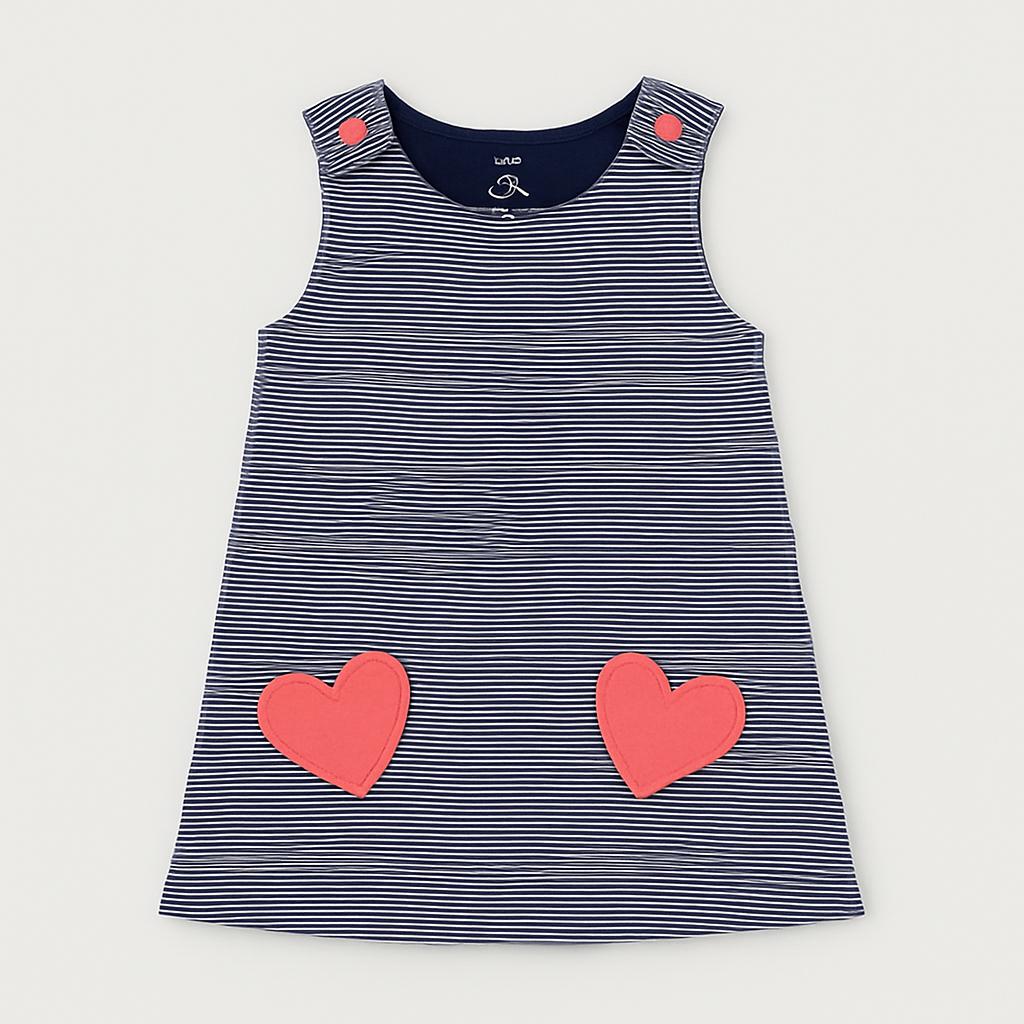 Questo delizioso abito a righe di marca Okaïdi è perfetto per far brillare il guardaroba della tua piccola! Con un taglio fresco e comodo, è realizzato in morbido cotone blu e bianco. Le spalline decorate con un tocco rosso e le adorabili tasche a forma di cuore in feltro corallo aggiungono un pizzico di dolcezza. Ideale per giornate di sole e giochi all'aperto, questo vestito usato è in ottime condizioni e pronto per essere indossato da una piccola stilosa. Un capo imperdibile per ogni piccola fashionista!