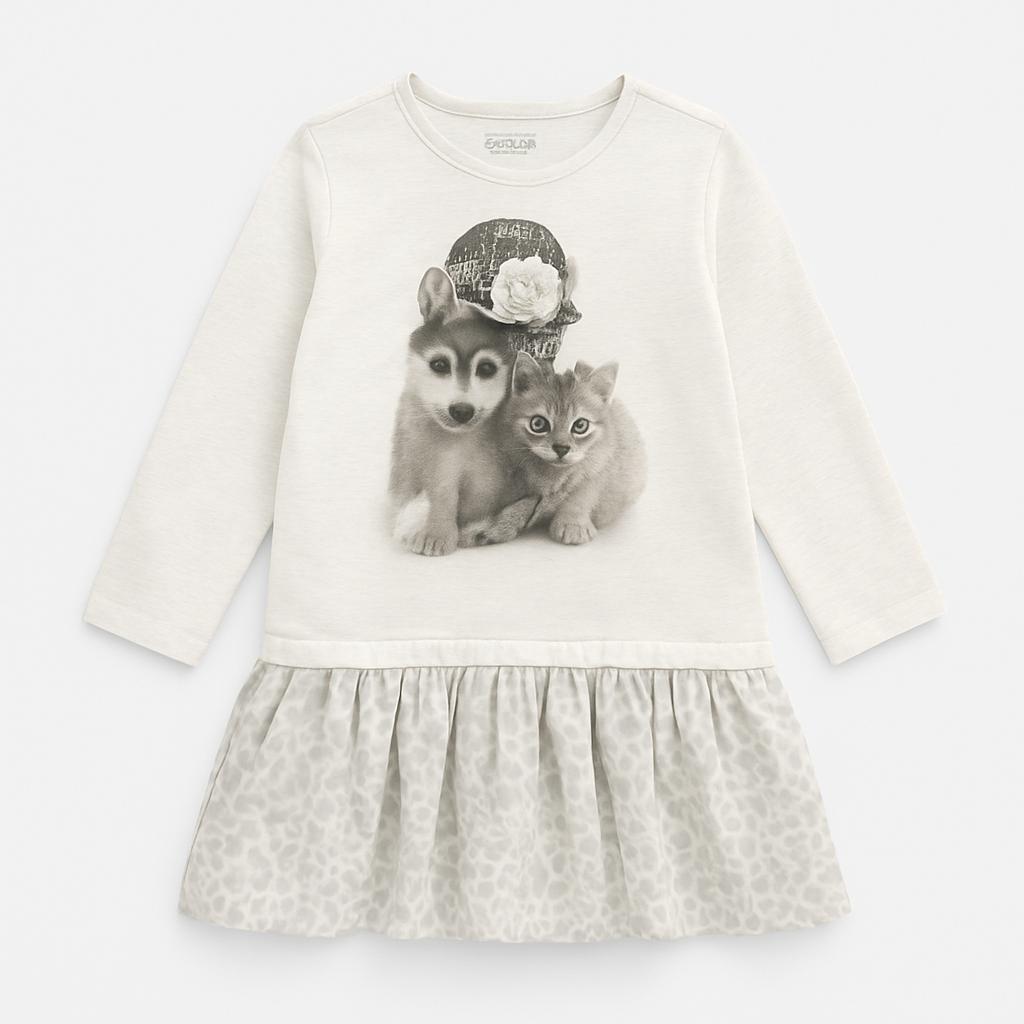 Questa adorabile vestitino grigio è perfetto per le piccole sognatrici! Realizzato in morbido cotone, offre comfort e stile. La parte superiore presenta una dolce stampa di un orsetto e una dolce amica, mentre la gonna a balze in un elegante tessuto leopardato aggiunge un tocco di unicità. Le maniche lunghe lo rendono ideale per le giornate fresche, perfetto per giocare in casa o per una passeggiata in famiglia. Nonostante sia usato, il vestitino si presenta in ottime condizioni. Un capo chic e divertente per le piccole trendsetter!