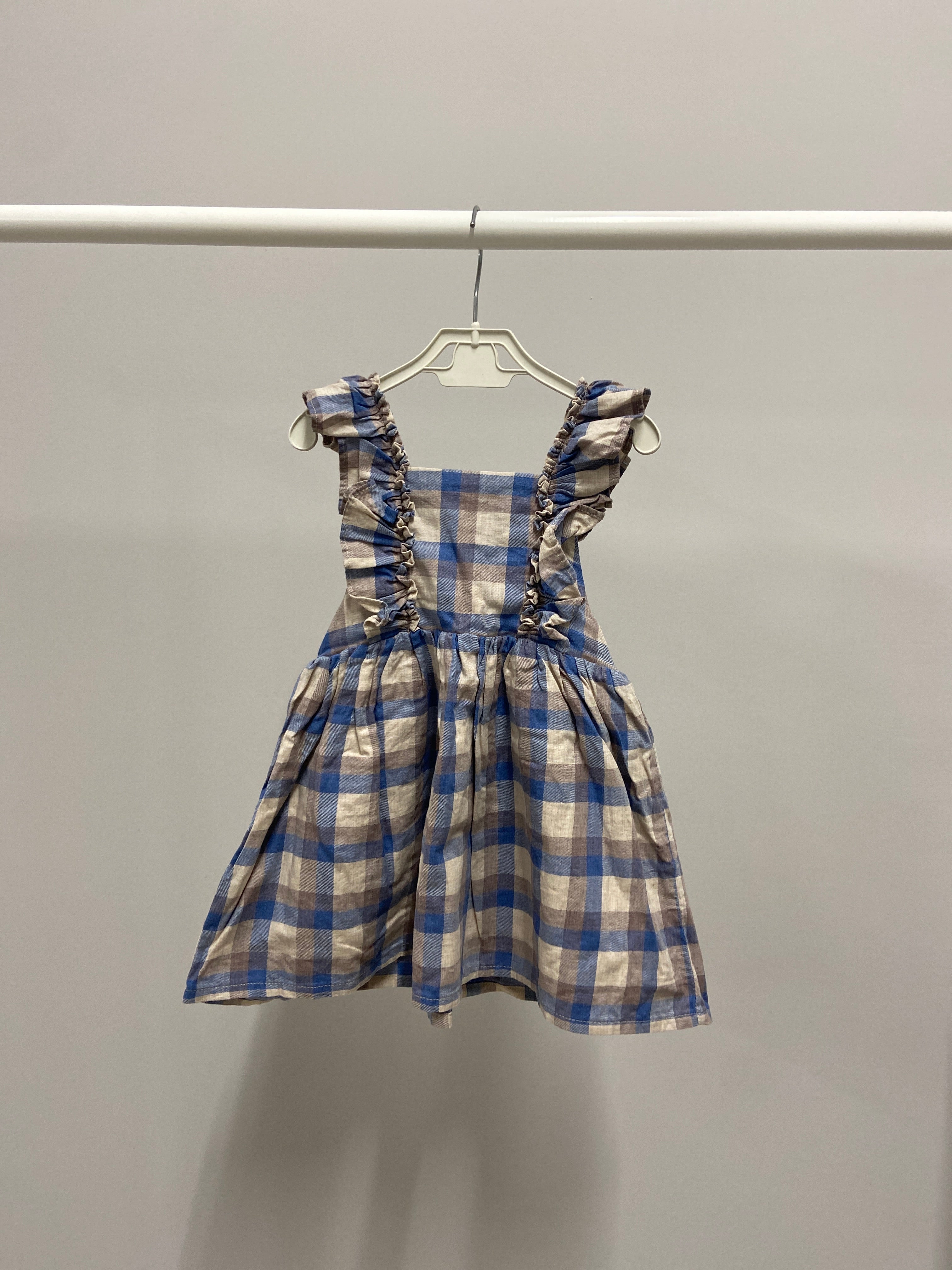 Questo adorabile vestitino a quadri è il sogno di ogni piccola stilista! Realizzato in morbido cotone, presenta un incantevole motivo a quadri blu e beige che richiama l'estate. Le spalline arricciate aggiungono un tocco di femminilità e charme, perfetto per le giornate di sole. La gonna ampia consente libertà di movimento per giocare e danzare senza pensieri. Anche se usato, il vestitino si presenta in ottime condizioni, pronto per essere indossato in ogni occasione. Un capo versatile che farà brillare il guardaroba delle piccole!