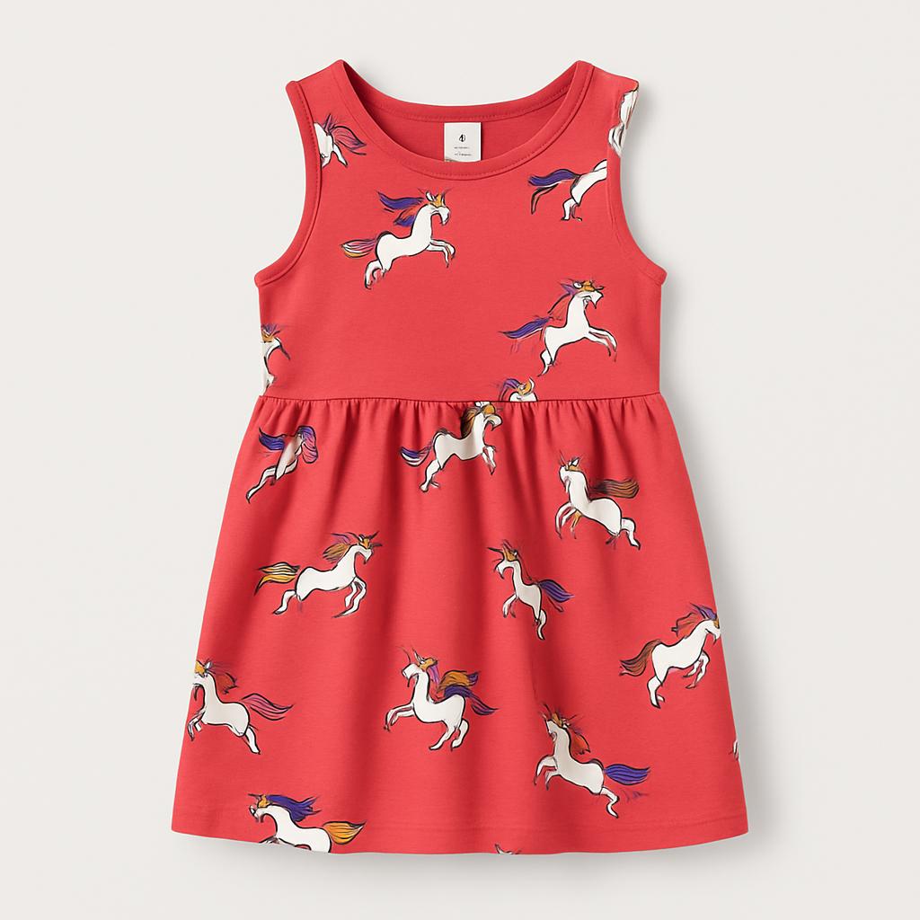 Questo incantevole vestitino di colore corallo è perfetto per tutte le piccole sognatrici! Realizzato in morbido cotone, presenta un divertente motivo di unicorni che danzano tra arcobaleni e nuvole. Le spalline sottili e la gonna ampia permettono libertà di movimento, ideale per le avventure quotidiane. Nonostante sia un capo usato, si presenta in ottime condizioni e aggiunge un tocco di magia e allegria al guardaroba di ogni bambina. Un vero sogno per chi ama sentirsi speciale!