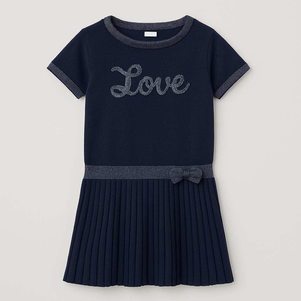 Questo adorabile vestito blu scuro è perfetto per le piccole sognatrici! Realizzato in un morbido tessuto, presenta una scritta "Love" sul petto, impreziosita da delicate finiture glitterate. Le maniche corte e la gonna plissettata aggiungono un tocco di eleganza e movimento, perfette per ballare e giocare. La cintura con un grazioso fiocco in vita regala un po’ di stile extra a questo look. Nonostante sia un capo usato, è in ottime condizioni e pronto per essere indossato in occasioni speciali o per un look quotidiano trendy!