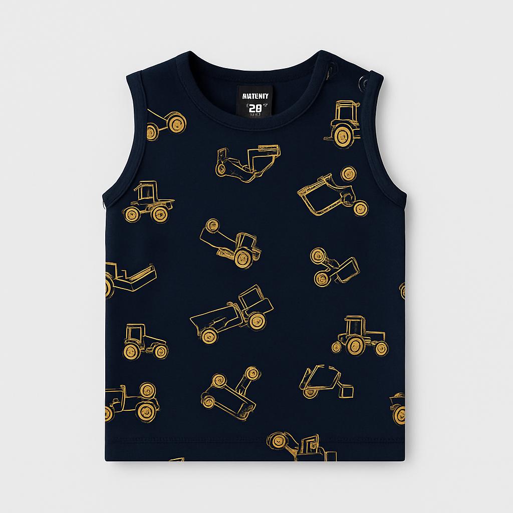 Questo adorabile top senza maniche è perfetto per i piccoli appassionati di avventure e mezzi di trasporto! Realizzato in un morbido cotone blu scuro, presenta un simpatico motivo di trattori e camion gialli che renderà ogni giornata di gioco ancora più divertente. Il design accattivante e il taglio comodo lo rendono ideale per l'estate e le attività all'aperto. Nonostante sia un capo usato, si presenta in ottime condizioni, quindi è pronto a far brillare il guardaroba del tuo bimbo avventuriero! Un must-have per i futuri piccoli costruttori!