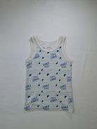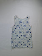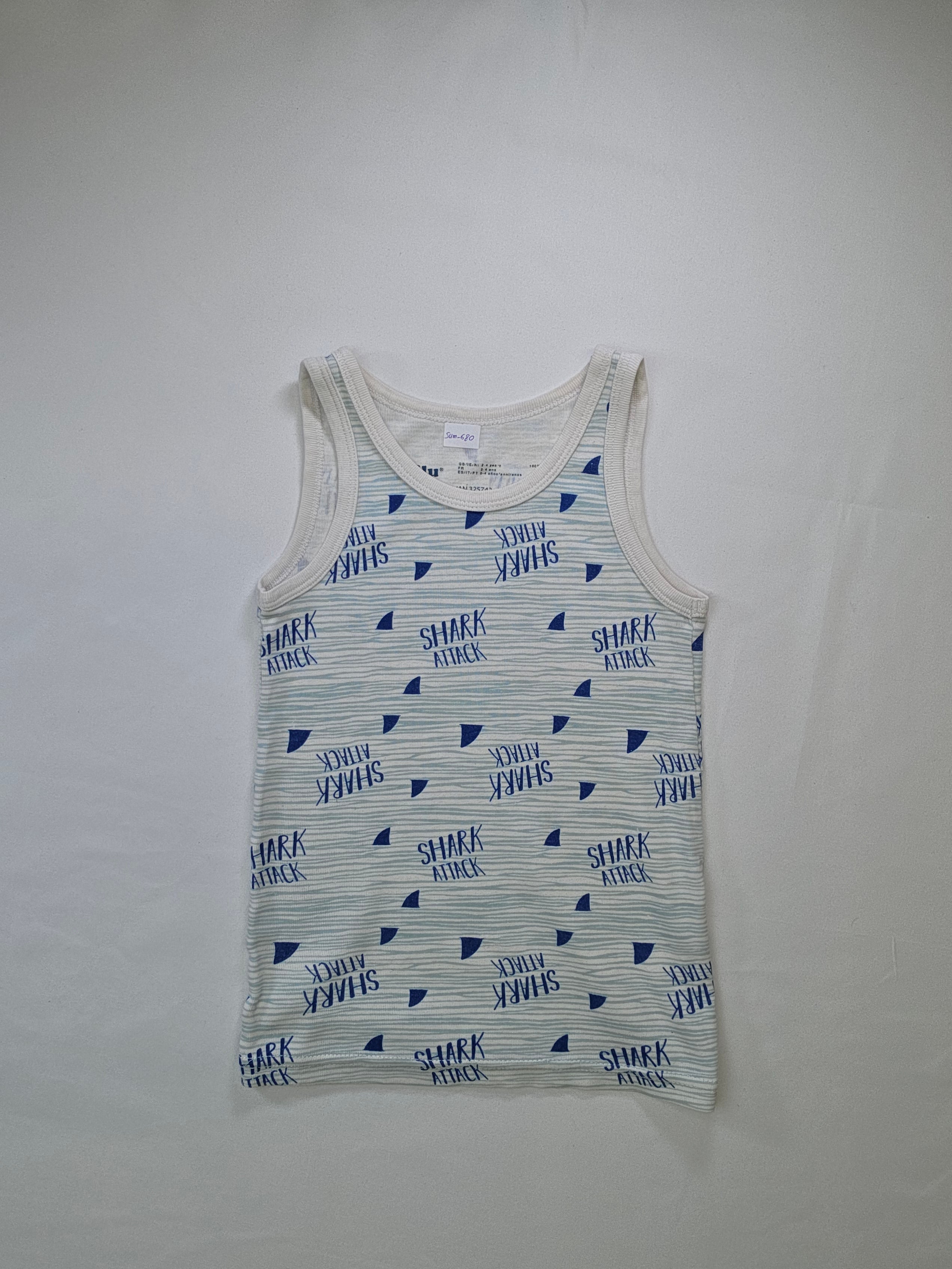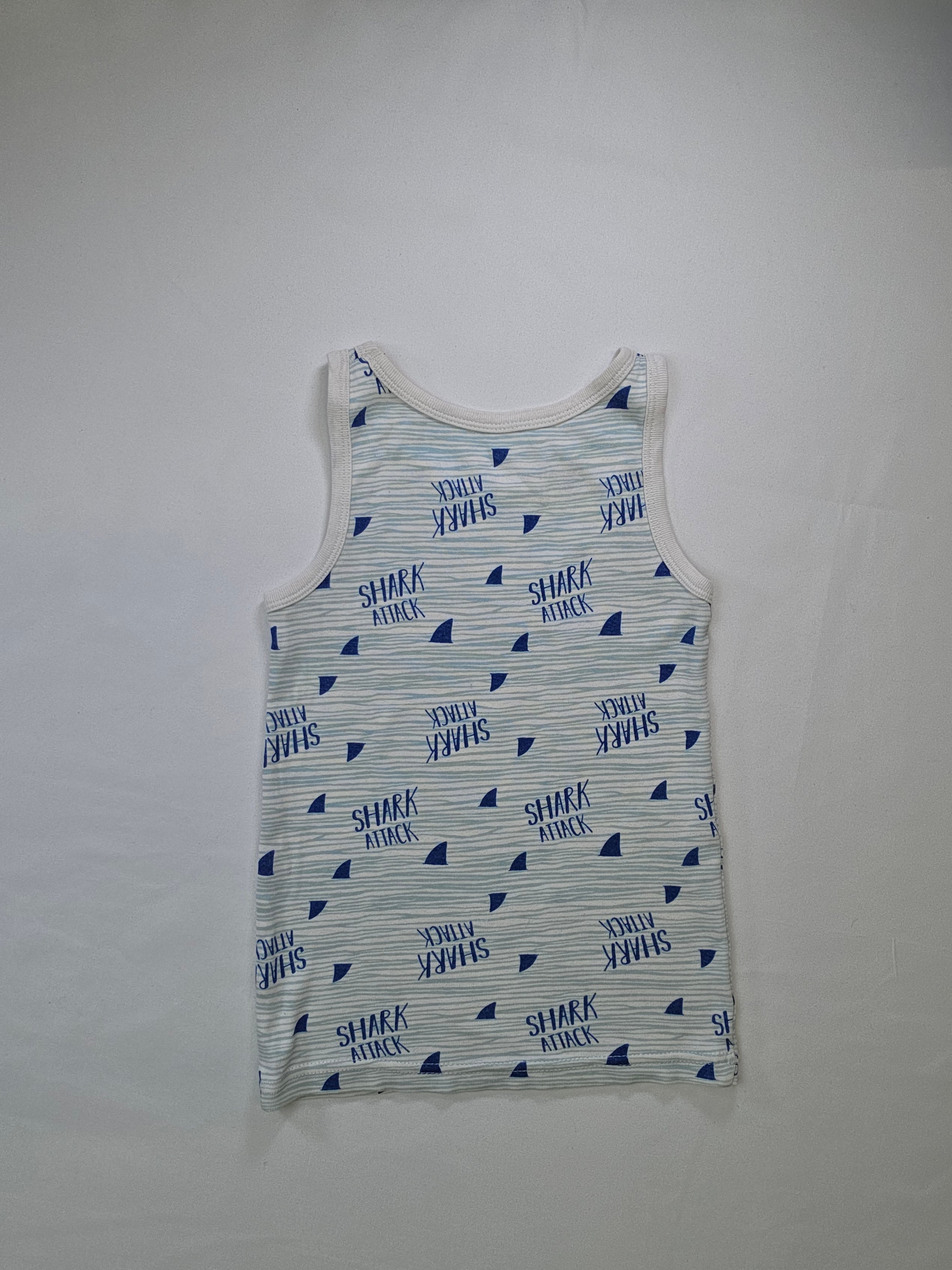 Questo divertente canottiera "Shark Attack" è perfetta per i piccoli amanti del mare! Realizzata in morbido cotone, offre comfort tutto il giorno. Con il suo design vivace e le scritte blu su sfondo chiaro, porta un tocco di avventura e allegria. Ideale per le giornate estive, al mare o durante il gioco in giardino, è il capo perfetto per le piccole pesti che vogliono esprimere il loro spirito audace. Anche se usata, si presenta in ottime condizioni e pronta per nuove avventure!