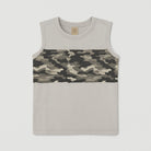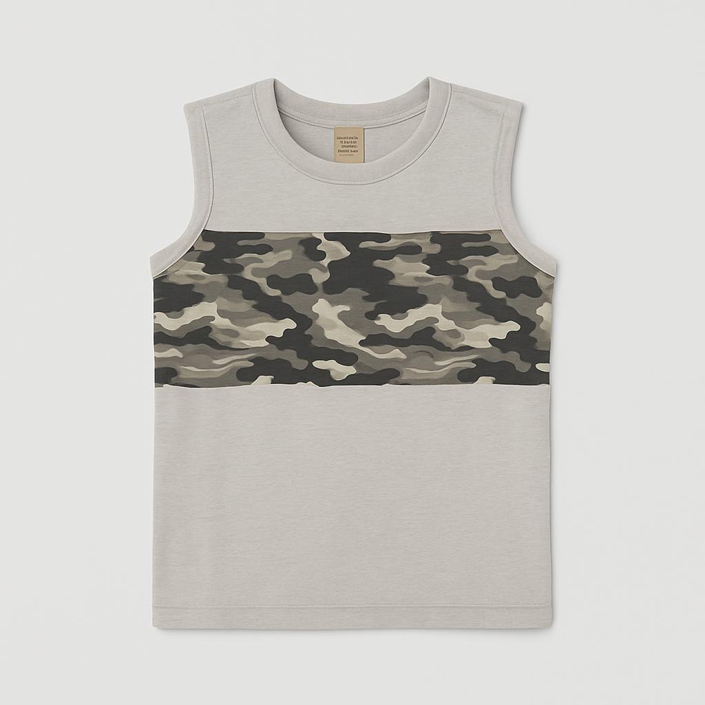 Questa originale canotta è perfetta per i piccoli amanti dello stile avventuroso! In un delicato grigio chiaro, è arricchita da una fascia centrale con stampa camouflage in tonalità di verde e grigio. La sua vestibilità comoda e le maniche corte la rendono ideale per le giornate estive, giochi all’aperto o semplicemente per un look casual ma trendy. Anche se è un capo usato, si presenta in ottime condizioni ed è pronto per essere indossato da un piccolo esploratore! Un'aggiunta versatilissima al guardaroba dei tuoi bambini!