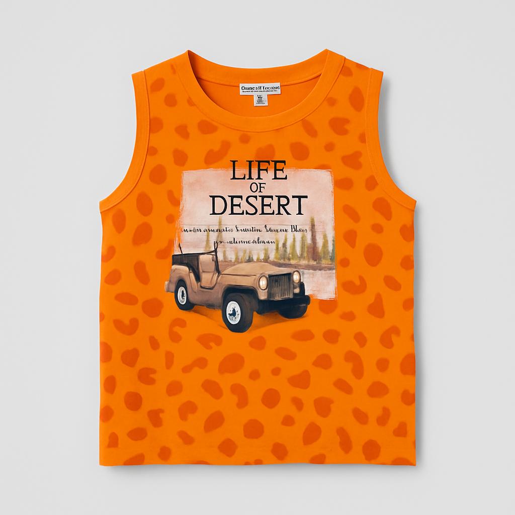 Questo vivace canotta arancione è perfetta per le piccole avventuriere! Realizzata in cotone morbido, presenta una stampa divertente con un'auto d'epoca e la scritta "LIFE in the DESERT". I dettagli a macchie rendono il capo ancora più giocoso e alla moda. È l'ideale per le calde giornate estive, giochi all'aperto o per creare un look casual e colorato. Nonostante sia usato, è in ottime condizioni e pronta a portare energia e stile nel guardaroba della tua piccola!