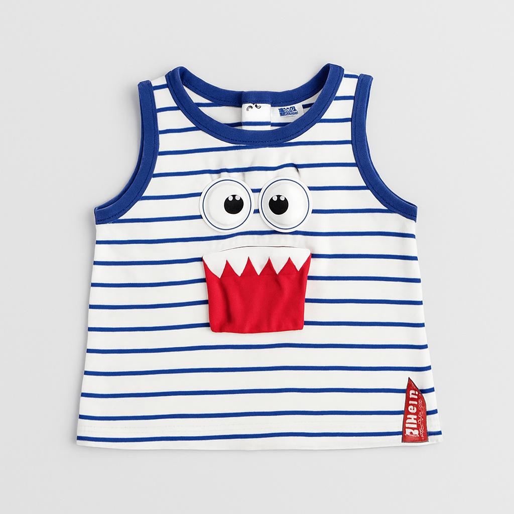 Questa simpatica canotta a righe blu e bianca è perfetta per le giornate estive e per i piccoli amanti del divertimento! Con il suo buffo design, caratterizzato da occhi grandi e una bocca a forma di mostro rossa, porterà un sorriso sul volto di ogni bambino. Realizzata in un morbido cotone, assicura comfort e freschezza, ideale per le avventure all'aria aperta. Nonostante sia un capo usato, si presenta in ottime condizioni, pronta per essere indossata da un vivace esploratore! Un must-have per il guardaroba estivo!