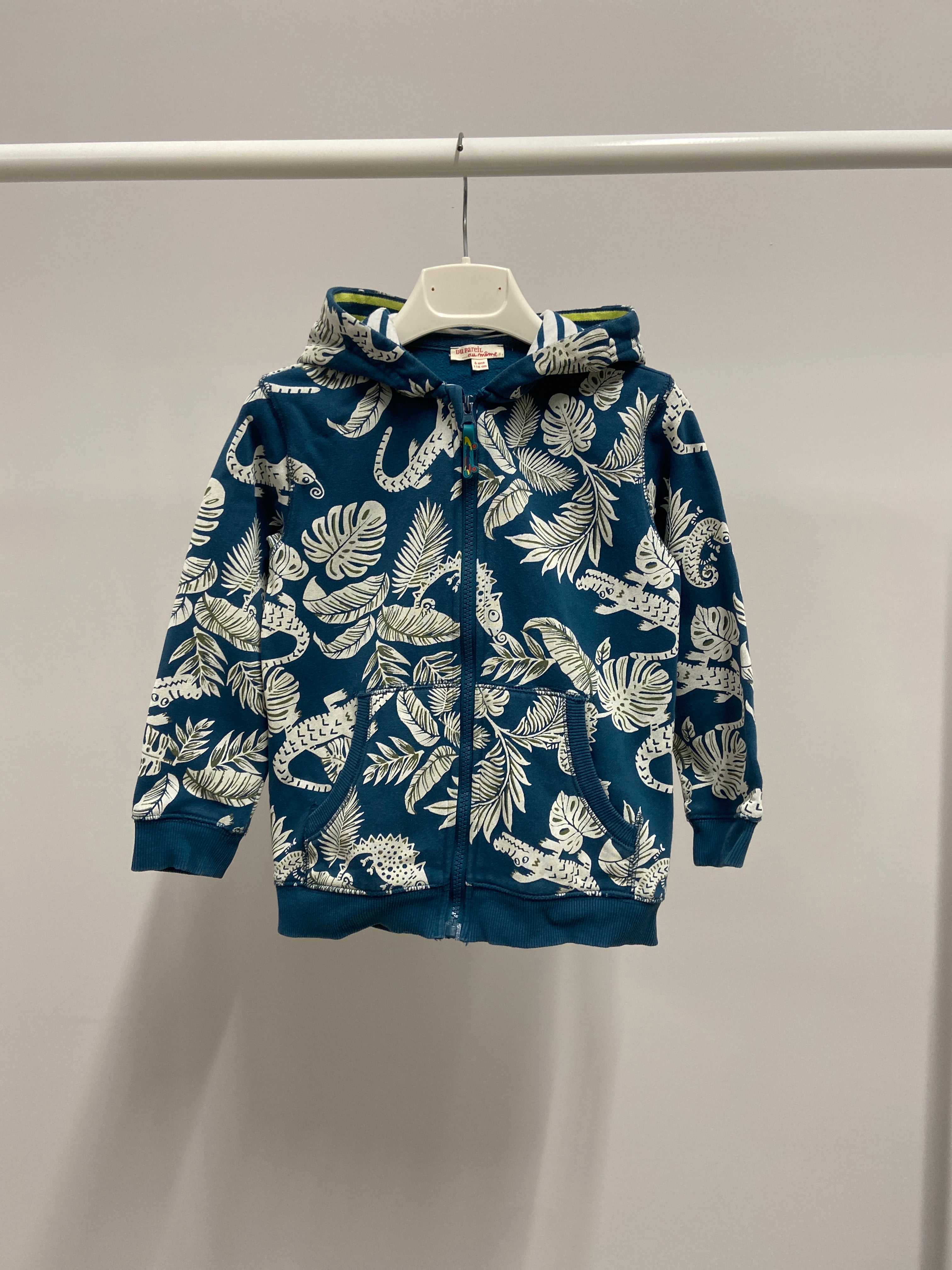 Scopri questa adorabile felpa con zip, perfetta per le avventure dei più piccoli! Caratterizzata da un vivace motivo tropicale con foglie bianche su fondo blu, cattura l'attenzione con il suo stile fresco e originale. Il cappuccio offre comfort e protezione, mentre la chiusura a zip la rende pratica per ogni occasione. Sebbene sia un capo usato, è in ottime condizioni e pronta per nuove esplorazioni. Indossata o aperta su una t-shirt, questa felpa sarà sicuramente un'ottima aggiunta al guardaroba dei piccoli amanti della natura!