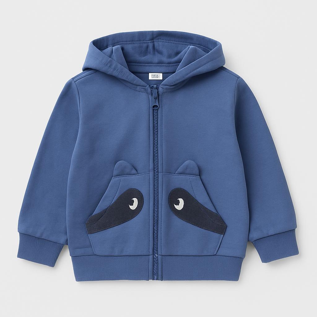 Indossa un sorriso con questa adorabile felpa con cappuccio! Di un fresco blu, è perfetta per le avventure all'aperto o per stare comodi a casa. Le simpatiche tasche a forma di muso di un animaletto aggiungono un tocco di dolcezza e divertimento. La zip frontale e il materiale morbido la rendono facile da indossare e comoda, ideale per affrontare ogni giornata con stile. Nonostante sia usata, è in ottime condizioni e pronta per accompagnare il tuo bambino in ogni suo gioco! Un must have per piccole esploratrici e esploratori!