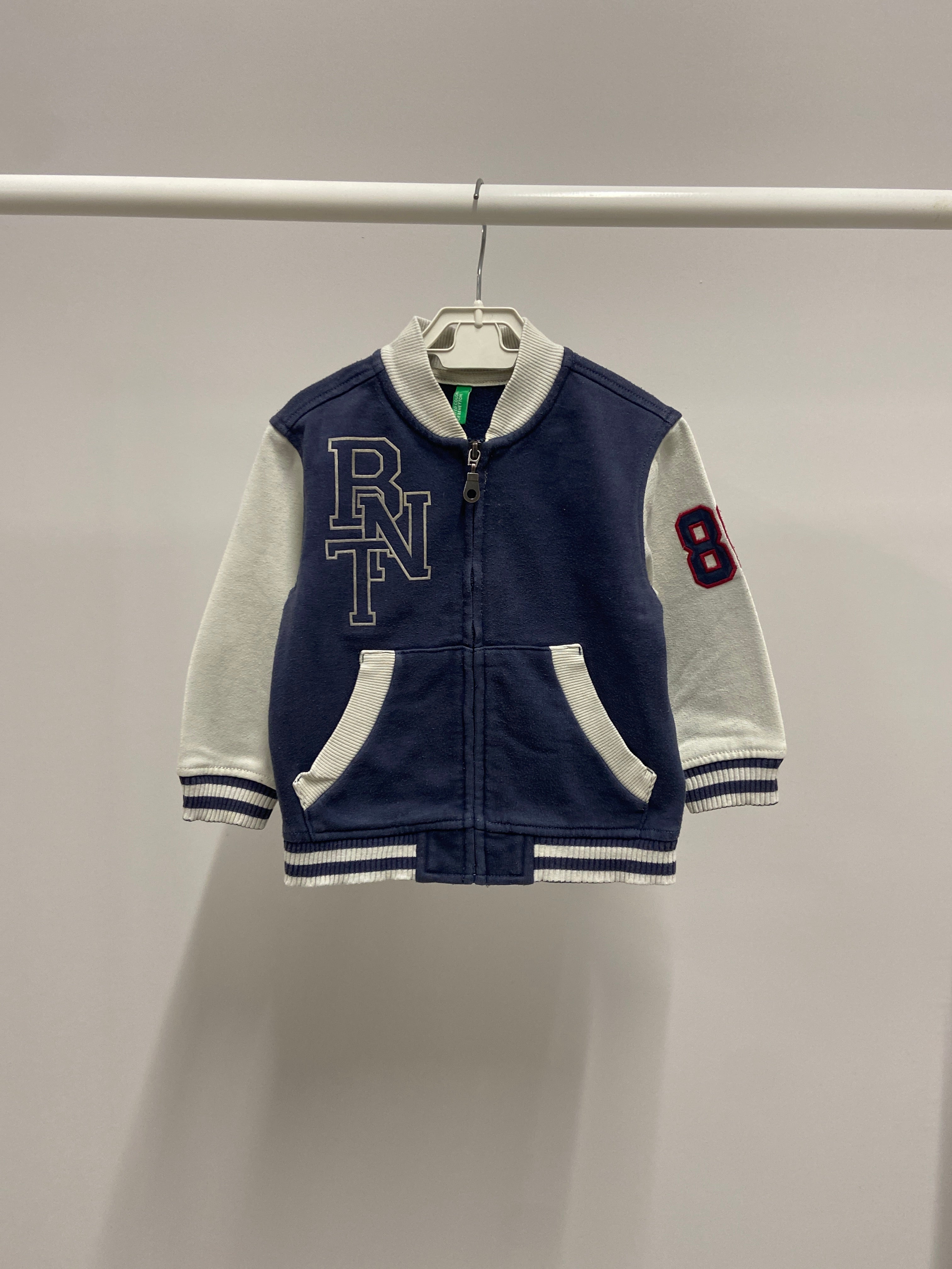 Questo giubbino sportivo è l’aggiunta perfetta per il guardaroba del tuo bambino! Realizzato in morbido cotone, il design in blu navy con maniche grigie e dettagli a righe bianche conferisce un tocco di freschezza. La zip frontale e le due tasche laterali lo rendono pratico e comodo per ogni avventura. La scritta "RNT 88" sul petto e il colletto alla coreana aggiungono un tocco di stile urbano. Nonostante sia un capo usato, è in ottime condizioni e pronto per accompagnare il tuo piccolo in tutte le sue esplorazioni!