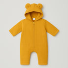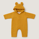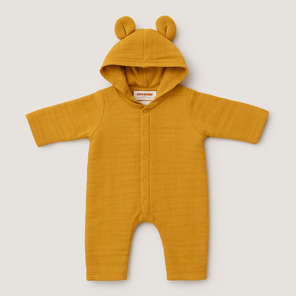 Questo adorabile completino per neonati è un vero tesoro! In un caldo e solare colore ocra, è realizzato in morbido tessuto cotone per garantire comfort e coccole. Il cappuccio con orecchie di orsacchiotto aggiunge un tocco giocoso e divertente, rendendolo perfetto per le piccole avventure. Le pratiche bottonature frontali facilitano il cambio e il design ampio permette libertà di movimento. Nonostante sia usato, è in ottime condizioni e pronto per nuove avventure! Un capo imperdibile per i più piccoli!