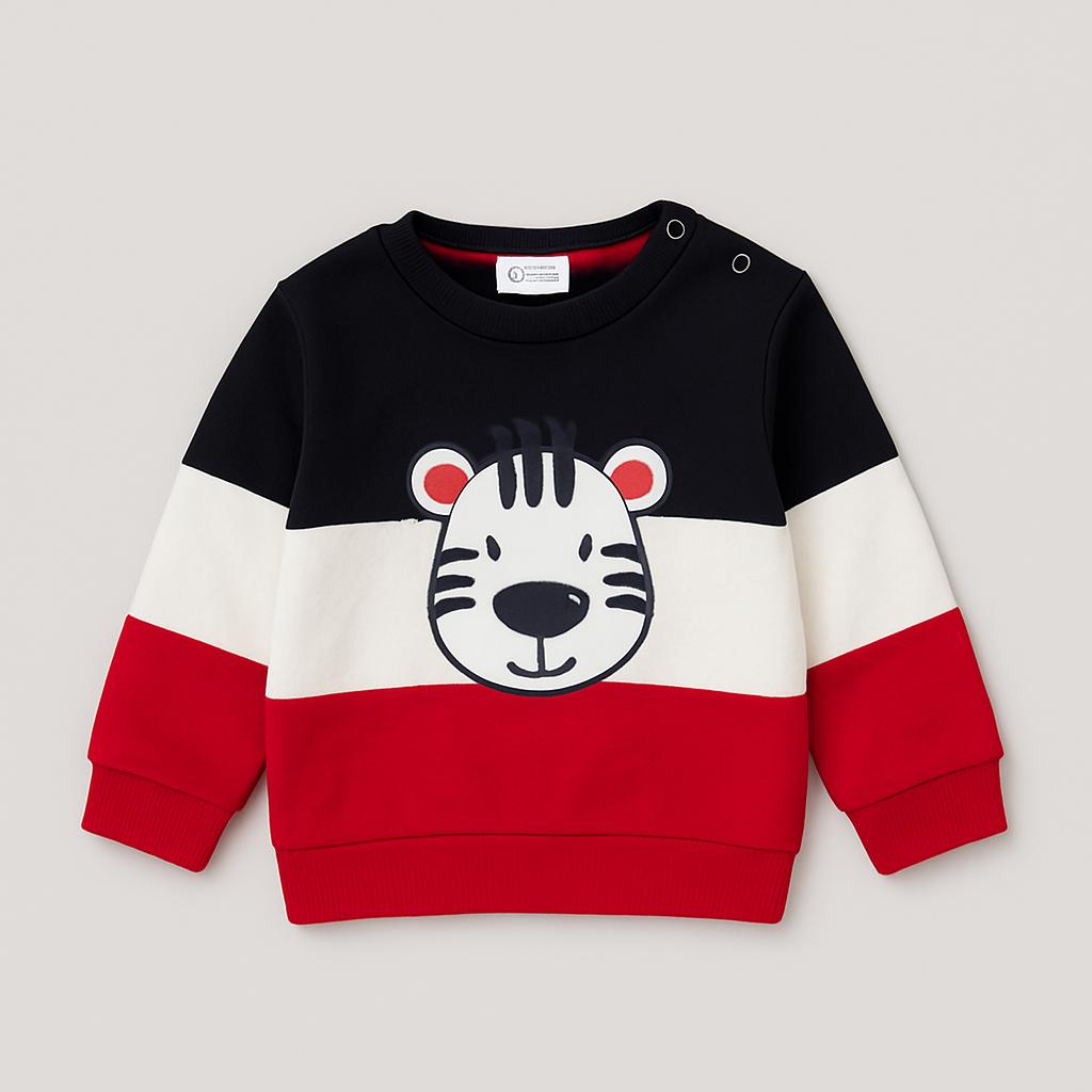 Questo adorabile pullover per bambini è un vero gioiellino! Con un originale design a righe in bianco, rosso e nero, cattura subito l'attenzione. Sul fronte spicca un dolce viso di zebra, che aggiunge un tocco giocoso e simpatico. Realizzato in un caldo tessuto, è perfetto per le giornate più fresche. Le spalle con bottoncini facilitano la vestizione, rendendolo pratico e comodo. Nonostante sia un capo usato, si presenta in ottime condizioni, pronto per accompagnare il tuo piccolo in mille avventure! Un must-have per un look trendy e divertente!