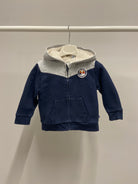 Questo adorabile giubbotto con cappuccio è perfetto per i piccoli esploratori! Realizzato in morbido materiale, offre un caldo comfort grazie alla fodera in pelliccia sul cappuccio. La combinazione di blu navy e grigio chiaro aggiunge un tocco moderno e versatile. Il logo decorativo sul fronte rende il capo speciale e alla moda. Con una chiusura a zip e tasche pratiche, è ideale per le avventure outdoor e le giornate fresche. Nonostante sia un capo usato, è in ottime condizioni e pronto per accompagnare il tuo bimbo in nuove avventure!