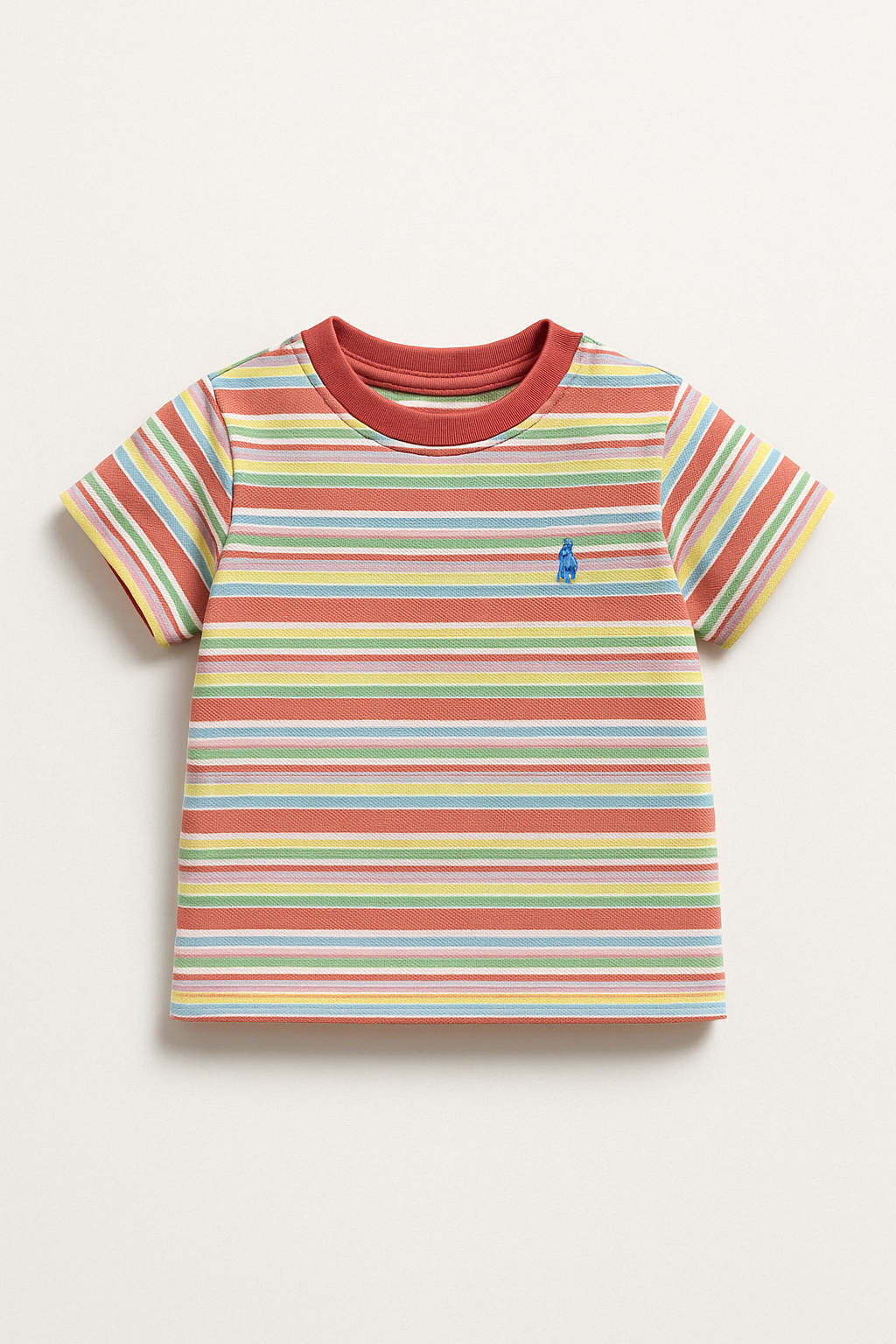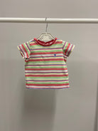 Questa adorabile t-shirt a righe della famosa marca Polo Ralph Lauren sarà un'aggiunta vivace al guardaroba del tuo bambino! Realizzata in morbido cotone, presenta un mix di colori freschi e solari, rendendola perfetta per ogni occasione. Le righe multicolori si abbinano meravigliosamente al colletto rosso, mentre il piccolo logo ricamato su un lato aggiunge un tocco di classe. Con le sue maniche corte e il taglio rilassato, è ideale per le giornate di gioco e svago. Nonostante sia un capo usato, è in ottime condizioni e pronta per essere indossata da un piccolo trendsetter!