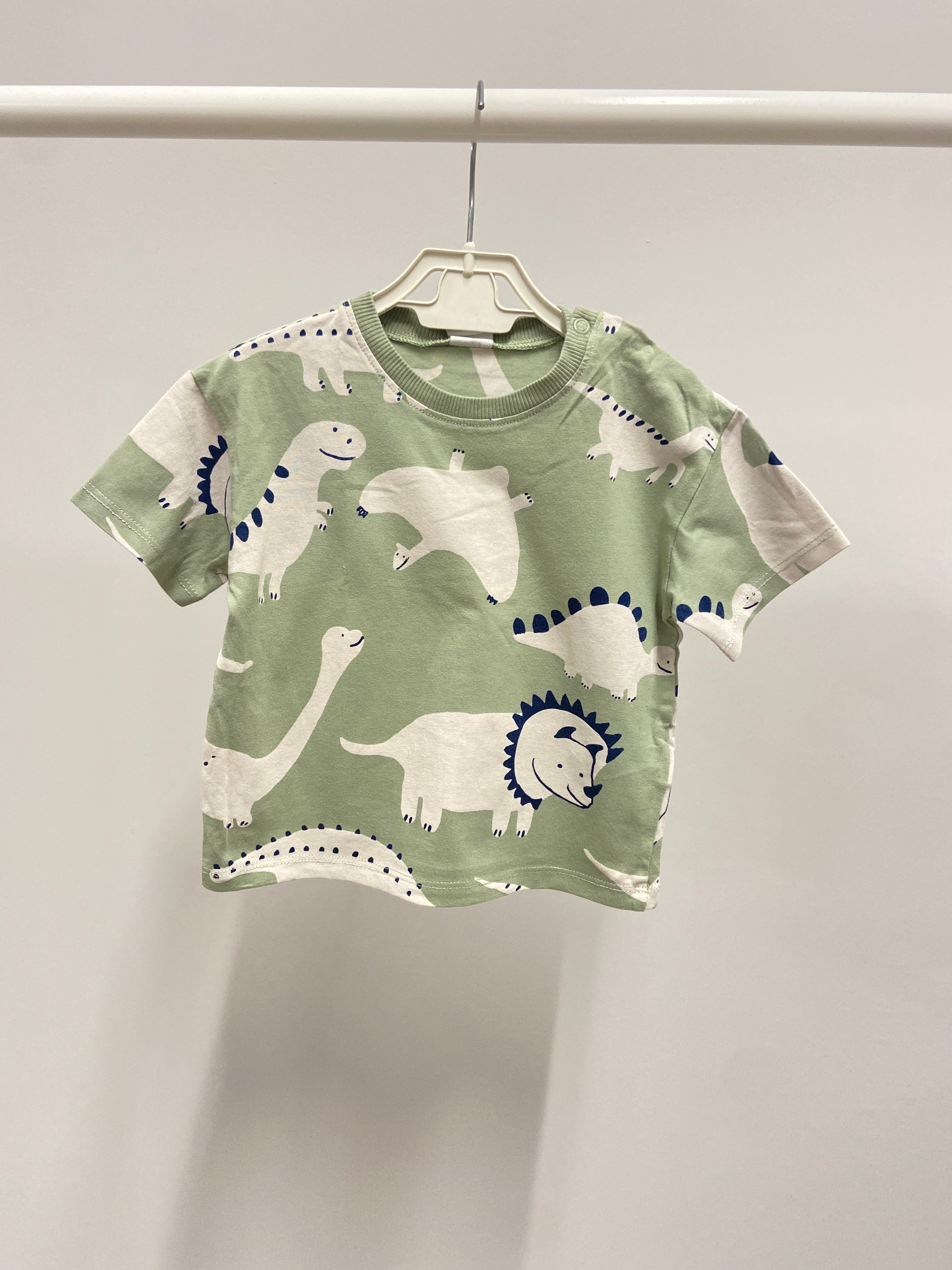 Questa adorabile t-shirt verde menta conquisterà il cuore dei piccoli amanti dei dinosauri! Realizzata in morbido cotone, sfoggia un divertente motivo di teneri dinosauri in bianco e blu, perfetta per stimolare la fantasia. Il taglio corto e le maniche comode la rendono ideale per le avventure estive o una giornata al parco. Nonostante sia un capo usato, si presenta in ottime condizioni e promette di aggiungere un tocco giocoso e vivace al guardaroba dei tuoi bambini. Un vero must-have per i piccoli esploratori!