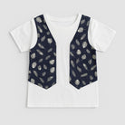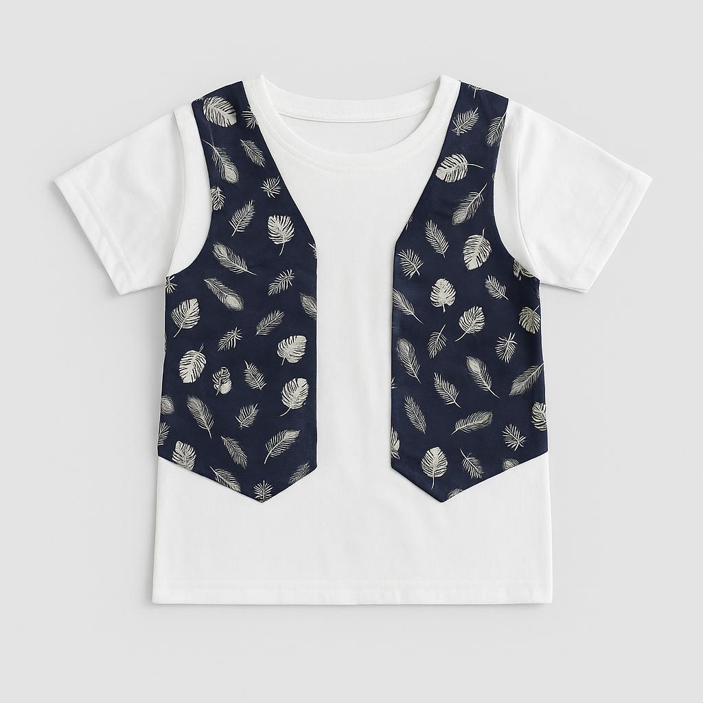 Questa originale t-shirt unirà divertimento e stile nel guardaroba del tuo bambino! Realizzata in morbido cotone bianco, presenta un'originale giacca incorporata con eleganti motivi di foglie su sfondo blu scuro. Il contrappunto tra il bianco della maglietta e il blu delle applicazioni offre un look fresco e giovanile, perfetto per le giornate di gioco. Nonostante sia un capo usato, è in ottime condizioni e pronta per nuove avventure. Ideale per piccole esploratrici e piccoli esploratori che amano distinguersi!