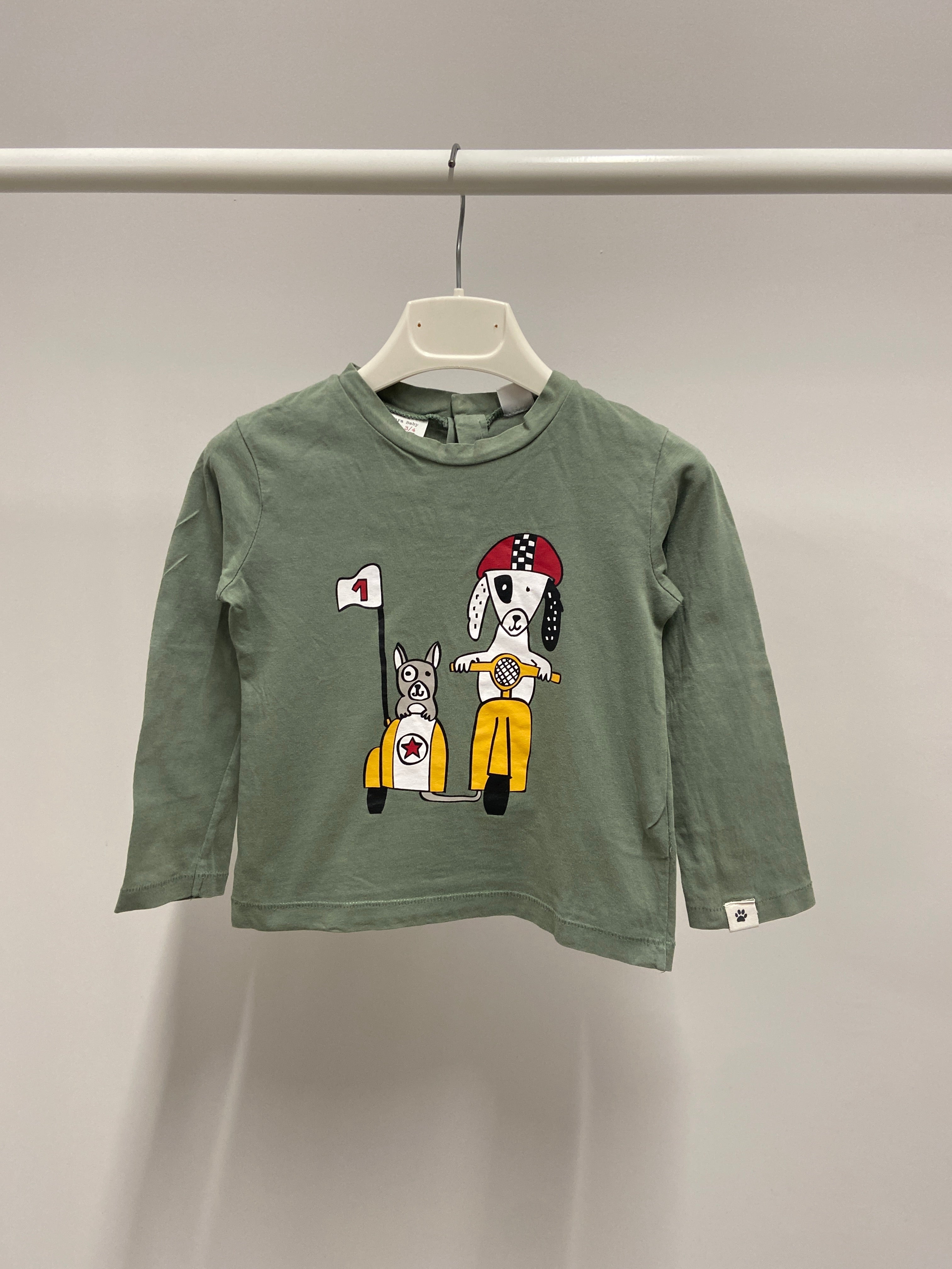 Questa adorabile maglietta a maniche lunghe è perfetta per i piccoli avventurieri! Realizzata in cotone morbido, presenta un grazioso motivo che raffigura un cane avventuroso su una bicicletta, accompagnato da un tenero amico. Il colore verde tenue offre un tocco fresco e originale, ideale per l'autunno. Con il suo taglio comodo e versatile, è perfetta per ogni occasione, dai pomeriggi di gioco alle uscite in famiglia. Nonostante sia un capo usato, è in ottime condizioni e pronta per dare vita a tante nuove avventure!
