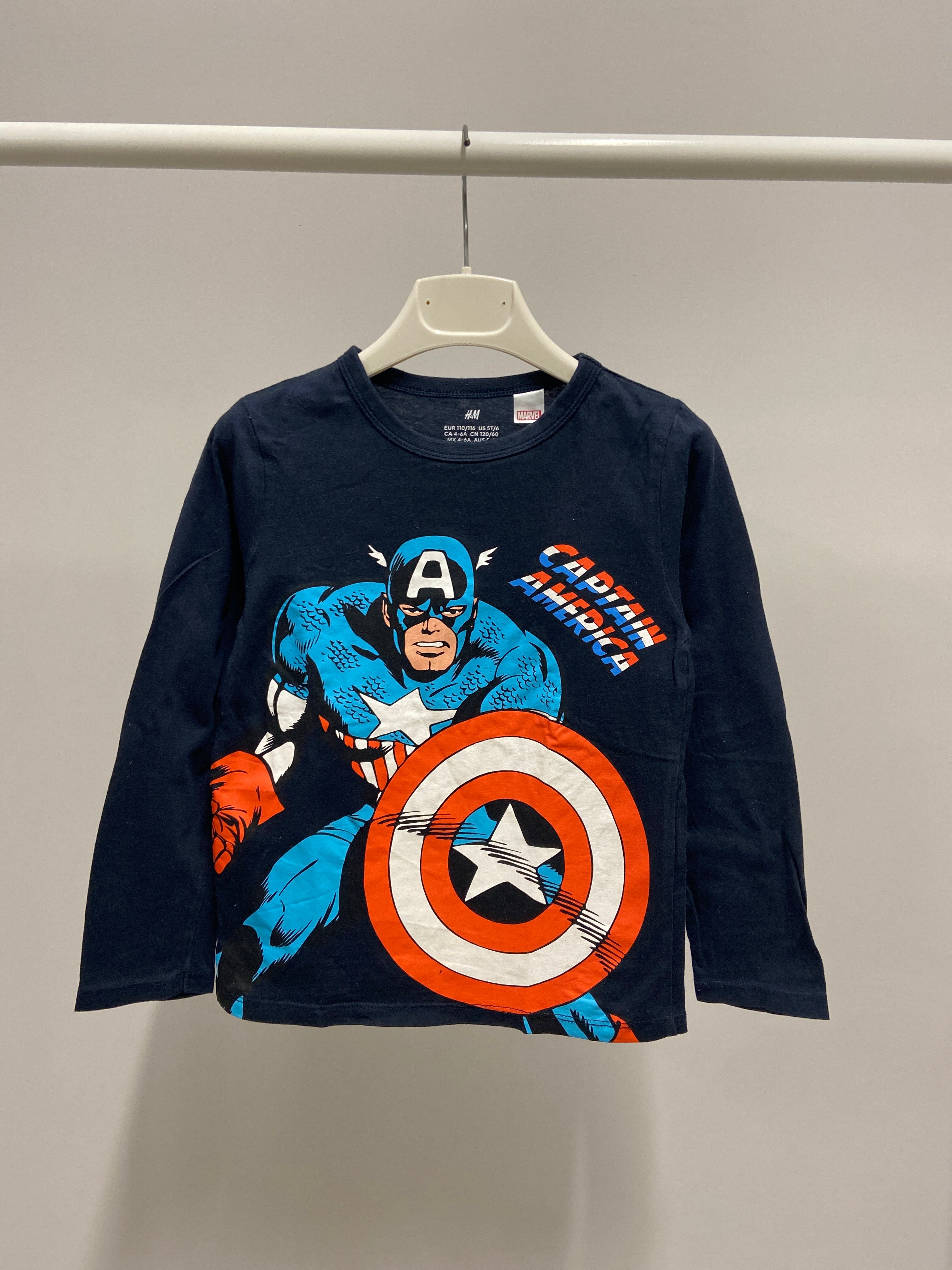 Questa fantastica maglietta a maniche lunghe, perfetta per i piccoli supereroi, è un vero colpo di fulmine! Realizzata in morbido cotone, presenta una vivace grafica di Captain America, che conquisterà il cuore di ogni bambino. Il fondo blu scuro mette in risalto il personaggio e il suo iconico scudo, rendendo questa maglietta perfetta per le avventure quotidiane.