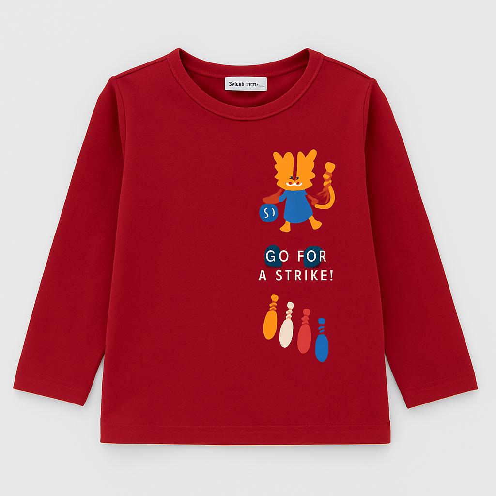 Questa simpatica maglietta a maniche lunghe in tonalità rosso scuro è perfetta per i piccoli amanti del divertimento! La scritta "GO FOR A STRIKE!" affiancata da divertenti illustrazioni di birilli, trasmette un'atmosfera giocosa e dinamica. Realizzata in un morbido cotone, assicura comfort per ogni avventura quotidiana. Ideale per le giornate più fresche, si abbina facilmente a jeans o pantaloni sportivi. Non lasciarti sfuggire questo pezzo usato ma in ottime condizioni, perfetto per un mini campione!