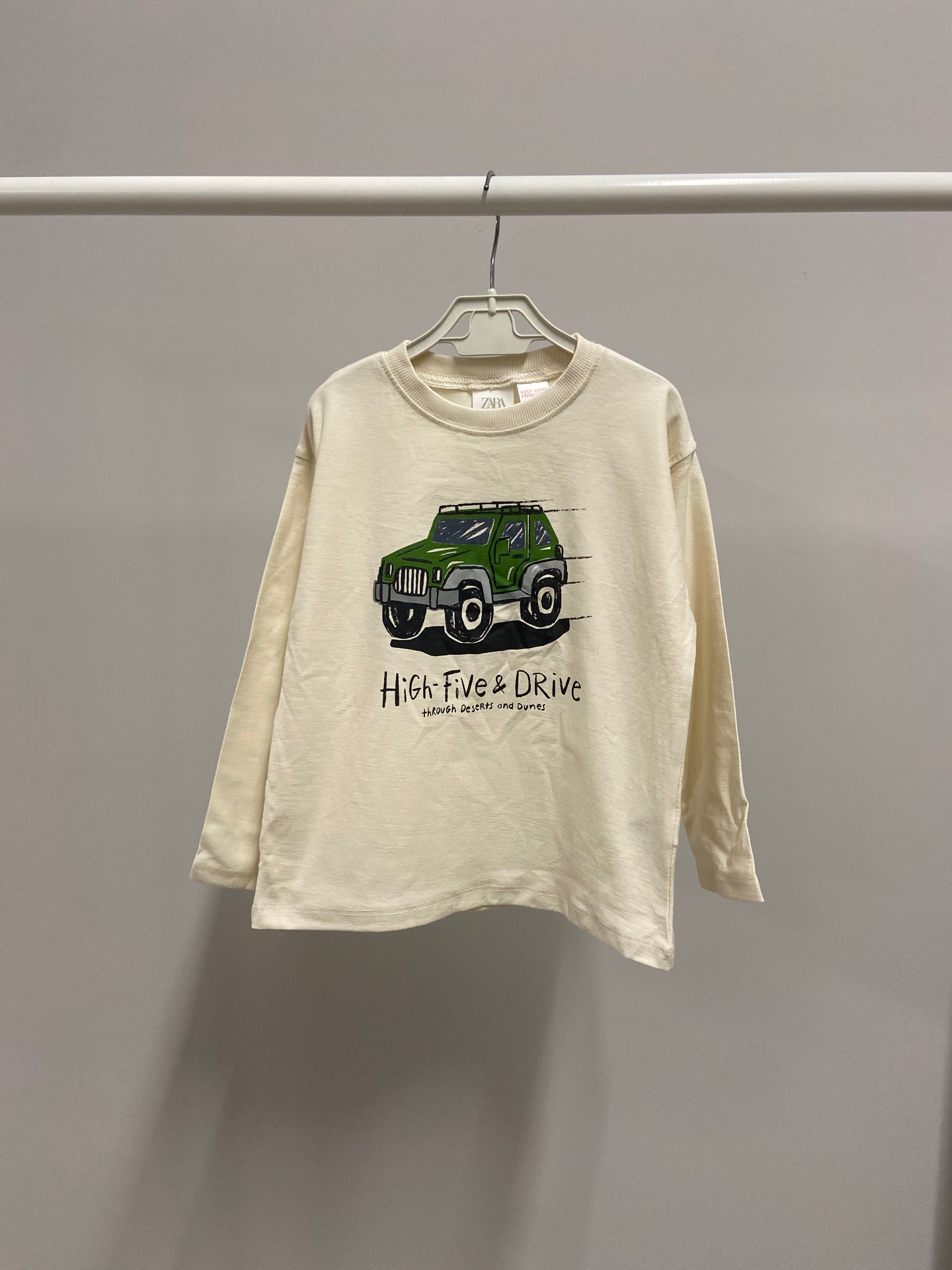 Questa adorabile maglietta a maniche lunghe è perfetta per i piccoli avventurieri! Realizzata in morbido cotone di colore crema, presenta un divertente stampa di un SUV verde che invita a scoprire il mondo. La scritta "High Five & Drive" aggiunge un tocco giocoso e spensierato, ideale per ogni giornata di gioco. Comoda e versatile, è perfetta per le avventure all'aperto o per un look casual. Anche se usata, si presenta in ottime condizioni, pronta per accompagnare il tuo bambino in innumerevoli scoperte! Un capo imperdibile per il guardaroba estivo!