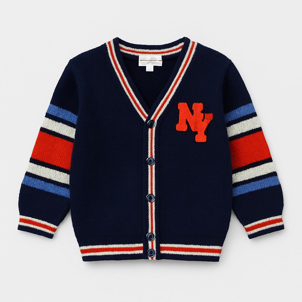 Questo affascinante cardigan in maglia è l'ideale per i piccoli alla moda! Realizzato in un caldo tessuto di ottima qualità, presenta un elegante colore blu navy, arricchito da accattivanti strisce rosse e bianche sulle maniche. Il logo "NY" applicato sul petto aggiunge un tocco sportivo e trendy. Con il suo design classico e le pratiche maniche lunghe, è perfetto per le fresche giornate autunnali o per completare look casual. Nonostante sia un capo usato, si presenta in ottime condizioni, pronto ad accompagnare le avventure quotidiane del tuo bambino con stile!