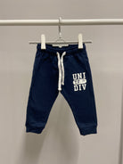 Questi adorabili pantaloni da jogging in blu navy sono l'ideale per i piccoli esploratori! Realizzati in morbido cotone, offrono comfort e libertà di movimento per ogni avventura. Il pratico elastico in vita e il cordoncino permettono una vestibilità regolabile, mentre il dettagliato logo “UNI DIV” aggiunge un tocco trendy.