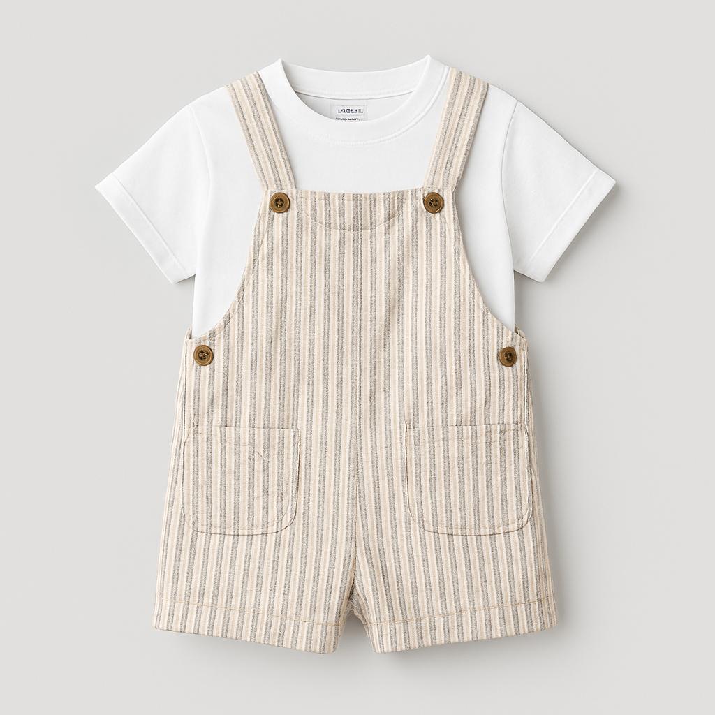 Questo adorabile set composto da salopette e t-shirt è perfetto per i piccoli esploratori! Le salopette a righe in morbido cotone sono dotate di pratiche tasche frontali e bottoni, aggiungendo un tocco vintage e giocoso. La t-shirt bianca abbinata è semplice ma versatile, ideale per ogni occasione. Questo outfit non solo offre comfort e libertà di movimento, ma è anche un classico che non passa mai di moda. Leggermente usato, è in ottime condizioni e pronto a diventare il preferito del tuo bambino!