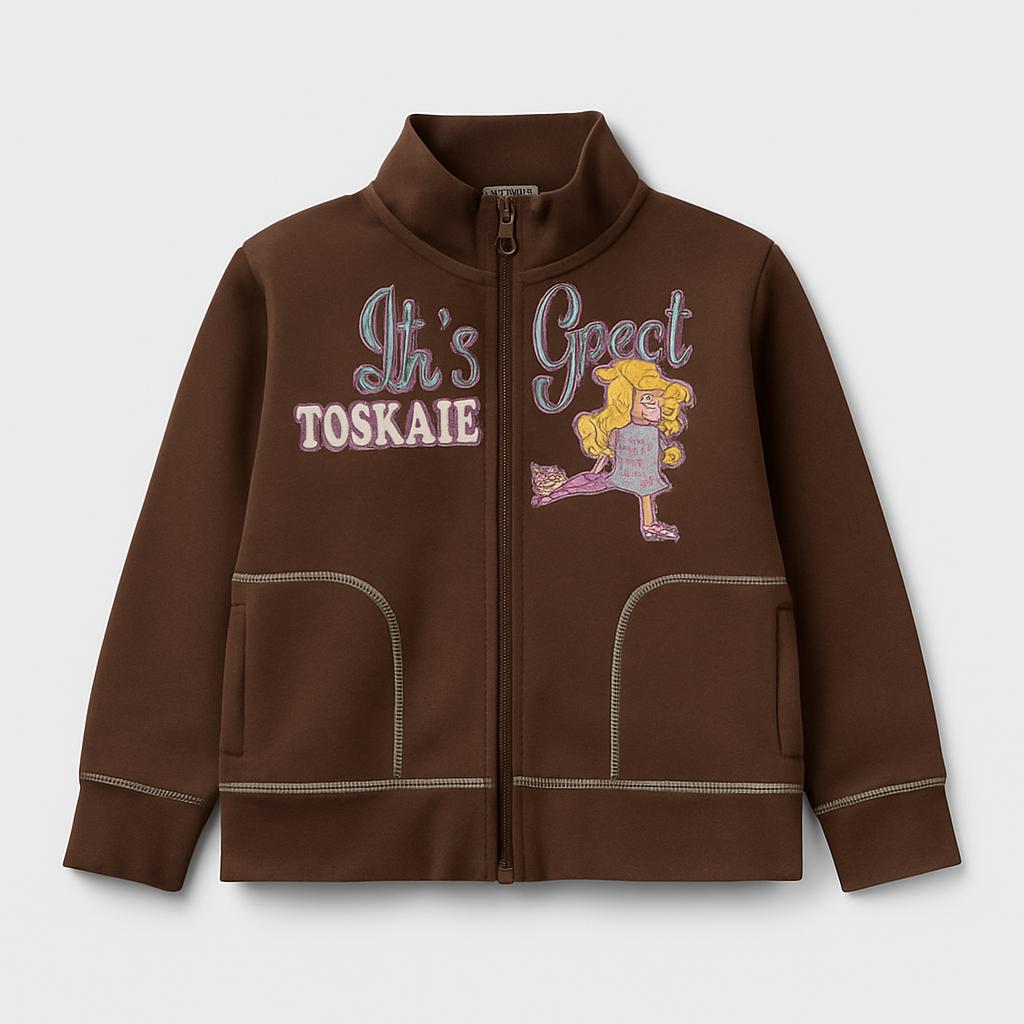 Scopri questa giacca zip-up di marca Toskate, perfetta per le giornate fresche! Realizzata in un morbido cotone marrone, la felpa è arricchita da un vivace ricamo colorato che celebra il divertimento e la creatività. Con un comodo colletto alto e tasche frontali, è ideale per le piccole avventuriere che amano esplorare il mondo! Nonostante fosse già amata, è in ottime condizioni e pronta a regalare calore e stile. Un capo versatile da indossare a scuola o durante le attività all'aperto!