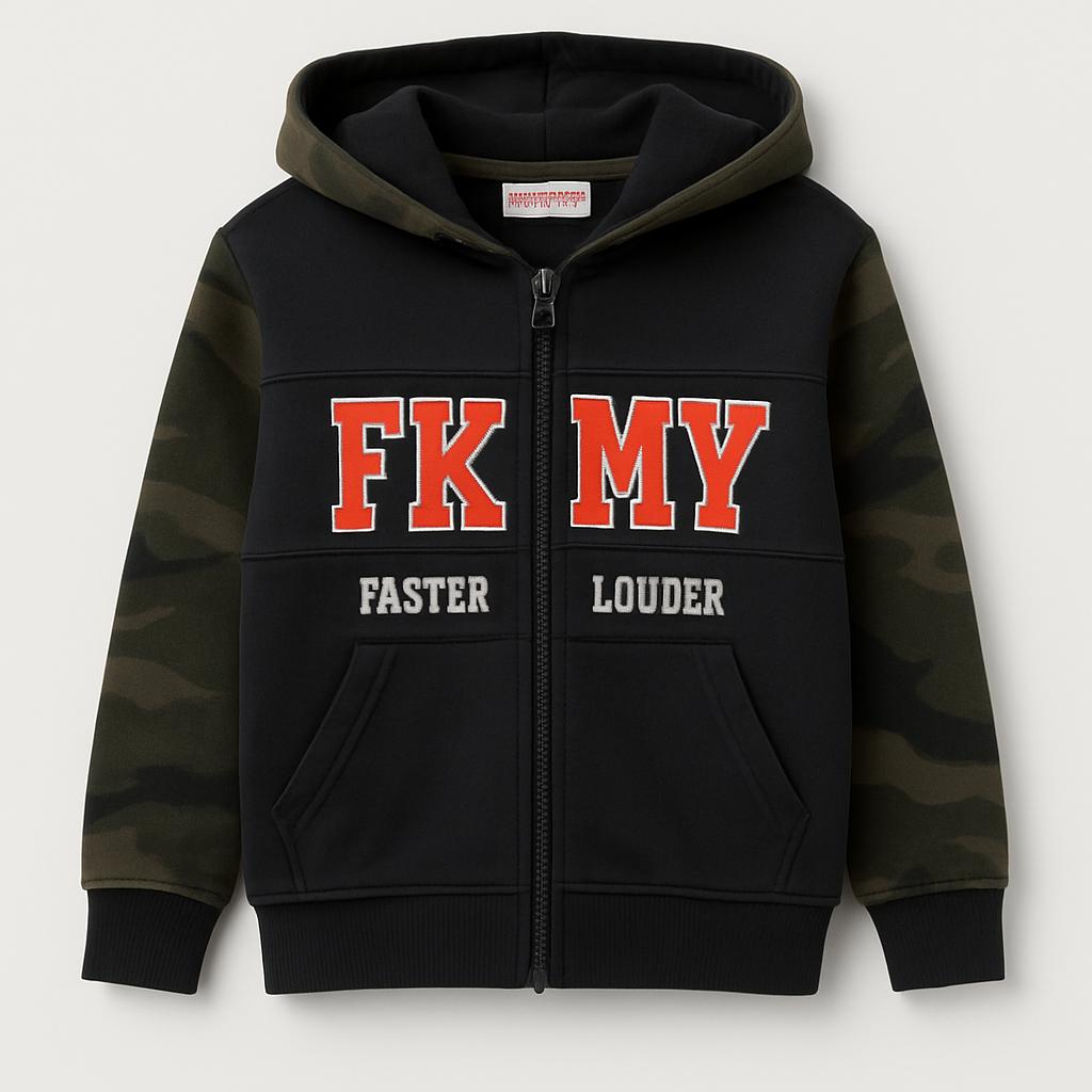 Questo originale hoodie di marca "Frannie M" è perfetto per i piccoli amanti dello stile trendy! Realizzato in morbido cotone, presenta un vivace contrasta di colori tra il nero e il camo, rendendolo ideale per ogni avventura. La zip rende facile indossarlo e toglierlo, mentre la scritta “FK MY” porta un tocco divertente e audace. Le tasche frontali sono perfette per riporre piccoli tesori o per scaldare le manine nei giorni freschi. Nonostante sia un capo usato, è in ottime condizioni e pronto per essere l'ideale del guardaroba dei tuoi bambini! Un must-have per i piccoli avventurieri!