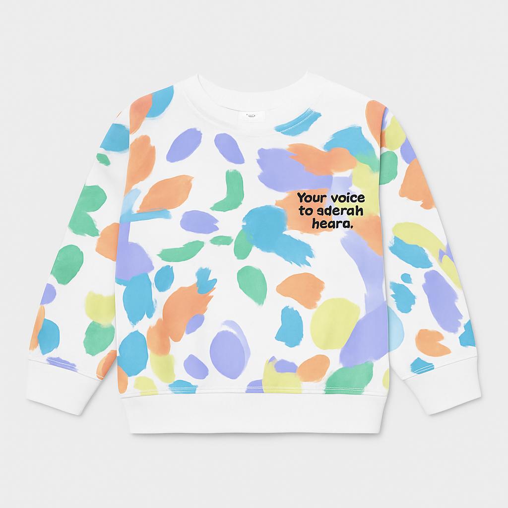 Questa adorabile felpa è un arcobaleno di colori che farà felice ogni piccolo! Realizzata in morbido cotone, presenta un vivace design con macchie in tonalità pastello di arancione, azzurro, verde e giallo. La scritta “Your voice is always heard” arricchisce il look con un messaggio positivo e stimolante. Con il suo taglio comodo e le maniche lunghe, è perfetta per le fresche giornate primaverili o autunnali. Sebbene sia un capo usato, si presenta in ottime condizioni e sarà un fantastico aggiunta al guardaroba dei tuoi bambini, ideale per chi ama esprimere la propria personalità!
