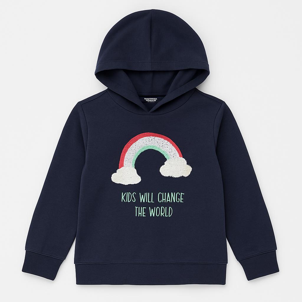 Questo adorabile hoodie in caldo cotone blu scuro è perfetto per le giornate fresche! Con un delizioso arcobaleno decorato con paillettes scintillanti, porta un messaggio importante "KIDS WILL CHANGE THE WORLD" che incoraggia i piccoli a sognare in grande. Il design con cappuccio offre comfort e stile, mentre il tocco morbido lo rende ideale per giocare o rilassarsi. Nonostante sia un capo usato, è in ottime condizioni, pronto per essere indossato da un piccolo sognatore. Un must-have per ogni guardaroba infantile!