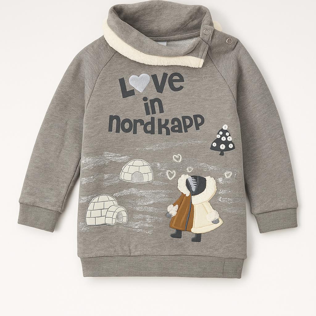 Questo adorabile pullover grigio è perfetto per le piccole avventuriere che amano lo stile e il comfort. Con l'inconfondibile scritta "Love in Nord Kapp" in lettere brillanti, porta un messaggio di amore e avventura. I dettagli del ricamo, con igloo e un personaggio vestito bene, aggiungono un tocco giocoso e originale. La colletto morbido e il tessuto caldo lo rendono ideale per le giornate fresche. Nonostante sia un capo usato, è in ottime condizioni e pronto per accompagnare la tua piccola in nuove avventure!